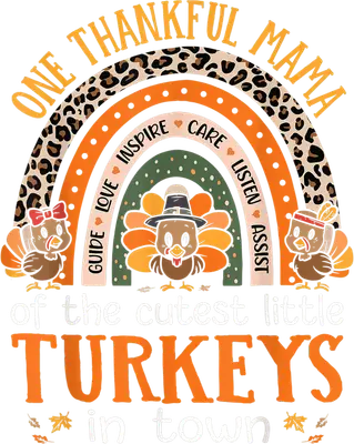 See allCelebrate motherhood and Thanksgiving with this charming "One Thankful Mama" DTF transfer! It features an adorable trio of cartoon turkeys—one in a pilgrim hat, another with a bow, and a third with a feather headband—beneath a vibrant, fall-themed rainbow. This rainbow boasts a stylish leopard print, warm orange stripes, and cozy green segments, adorned with inspiring words like "GUIDE," "LOVE," and "CARE." The playful phrase "of the cutest little TURKEYS in town" makes it a perfect, ready-to-press statement for proud mamas. This adorable heat transfer design is perfect for mothers, grandmothers, and anyone cherishing little ones during Thanksgiving. It's an excellent choice for family gatherings, fall festivals, or simply showing off maternal pride. Small t-shirt businesses and Etsy sellers in holiday apparel will find this iron on transfer a popular addition. Imagine matching shirts for Thanksgiving dinner or a thoughtful gift for a new mom celebrating with her "turkeys." Applying this heat press transfer is easy for crafters and beginners. It adheres beautifully to cotton, polyester, blends, and nylon. Use a heat press at 300-325°F for 15 seconds with medium pressure, or a household iron. No weeding is required – just peel and press! This versatile design is perfect for custom t-shirts, hoodies, tote bags, and baby onesies. For lasting durability, wash inside out and tumble dry low. Our ready to press transfer ensures exceptional quality with vibrant full-color printing and crisp details. You'll love the crack-resistant finish and soft, lightweight feel, free from heavy vinyl texture. Each direct to film transfer is printed on premium DTF film with strong adhesive backing for effortless application and professional results, designed to maintain its charm wash after wash.
