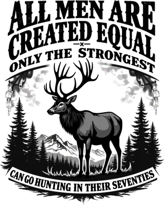 This striking DTF transfer features a magnificent elk standing proudly amidst a serene mountain forest landscape, framed by tall pine trees. The grayscale design exudes a rugged, classic outdoor aesthetic. Boldly emblazoned above and below is the witty quote: 'ALL MEN ARE CREATED EQUAL -X- ONLY THE STRONGEST CAN GO HUNTING IN THEIR SEVENTIES.' This ready to press design perfectly captures the spirit of experienced hunters with a touch of humor. This unique design is perfect for seasoned hunters, grandfathers, or any man who still loves the thrill of the hunt well into his golden years. It makes an ideal gift for Father's Day, birthdays, Christmas, or to celebrate a successful hunting season. Small business owners, crafters, and Etsy sellers can use this iron on transfer to create best-selling apparel. Show off dedication to the outdoors with this humorous heat transfer design that resonates with true outdoorsmen. Applying this heat press transfer is incredibly easy! It adheres beautifully to a wide range of materials including cotton, polyester, and their blends, and even nylon. For best results, use a heat press at 300-325°F for 15 seconds with medium pressure, or follow instructions for a household iron. There's no tedious weeding required—simply peel and press for a flawless finish. Create custom t-shirts, hoodies, sweatshirts, tote bags, or even aprons that stand out. Wash garments inside out and tumble dry low to ensure the design lasts. Our ready to press transfer ensures exceptional quality with vibrant, full-color printing and crisp, fine details that truly bring the design to life. Unlike heavy vinyl, this transfer offers a soft, lightweight feel that is comfortable to wear and resistant to cracking or peeling. Each direct to film transfer is printed on premium DTF film using high-quality inks and a robust adhesive backing, guaranteeing professional-grade results on every garment. Experience superior durability and a professional finish with dtf.market.