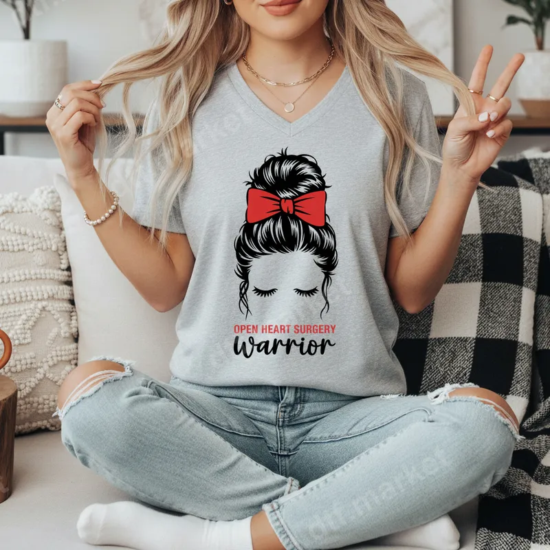 See allThis vibrant Open Heart Surgery Warrior DTF transfer features a stylish messy bun adorned with a striking red awareness bow, symbolizing heart health and strength. Below the graphic, the powerful message "OPEN HEART SURGERY WARRIOR" is emblazoned in bold red and elegant black script, making it a truly impactful design. This high-quality, ready to press transfer is perfect for creating custom apparel that speaks volumes about resilience and courage. This inspirational heat press transfer is ideal for open heart surgery survivors, their families, and dedicated caregivers. It's a wonderful way to commemorate a successful recovery, raise awareness for heart health, or show unwavering support for someone on their journey. Perfect for awareness walks, fundraising events, or as a thoughtful gift for a heart warrior, this design celebrates endurance and a fighting spirit. Applying this design is simple and hassle-free. Our durable heat press transfer works flawlessly on a wide range of fabrics, including cotton, polyester, and various blends. For best results, use a heat press at 300-325°F for 15 seconds with medium pressure. It can also be applied with a household iron (follow specific instructions). Forget weeding vinyl; this iron on transfer comes ready to press, saving you time and effort. Experience superior quality with this professional-grade t-shirt transfer. Our DTF transfers are known for their incredibly vibrant colors, exceptional durability, and soft-to-the-touch finish that won't crack or peel. Crafted using premium DTF film and strong adhesive, your finished garment will stand up to countless washes while maintaining its crisp detail and rich hues, offering a professional custom look.