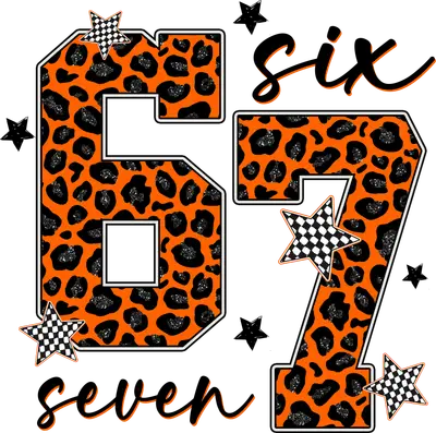 See allEmbrace a vibrant and energetic look with this eye-catching DTF transfer, showcasing the bold numerical design '67' in a trendy orange and black leopard print. Outlined crisply in white and adorned with small, edgy checkered stars, this design also includes the script words "six" and "seven" to complement the numbers. It's a perfect blend of sporty spirit and fashion-forward style, making it a professional ready to press design that truly stands out. This fantastic iron on transfer is perfect for cheerleaders, dancers, sports enthusiasts, or anyone wanting to add a custom touch to their apparel. It's an ideal choice for spirit wear creators, boutique owners, or individuals looking to personalize garments for game days, school events, cheer competitions, or team parties. Give it as a unique birthday gift for someone who loves bold patterns and numbers, or create matching team shirts that pop. Applying this heat press transfer is simple and efficient. It works flawlessly on a wide range of fabrics including cotton, polyester, cotton-poly blends, and even nylon. Achieve professional results by using a heat press at 300-325°F for 15 seconds with medium pressure, or you can use a household iron. There's no tedious weeding required – just peel and press. This custom t-shirt transfer is perfect for hoodies, sweatshirts, tote bags, jersey apparel, pillow covers, and denim jackets. For lasting durability, wash inside out and tumble dry low. Experience superior quality with this professional ready to press transfer. It features vibrant, full-color printing that captures fine details and textures, ensuring your design looks crisp and dynamic. Enjoy a crack-resistant, soft-to-the-touch finish with none of the heavy, stiff feel of traditional vinyl. Each direct to film transfer is expertly printed on premium DTF film, utilizing a strong adhesive backing for consistent, high-quality results every single time.