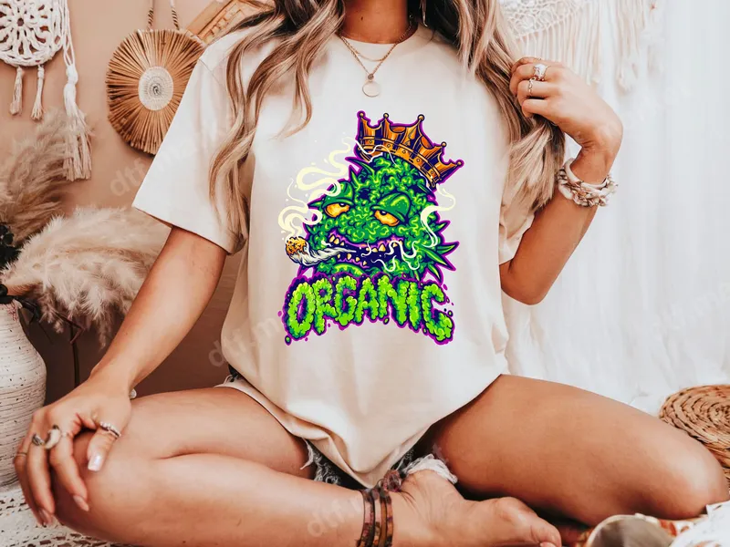 See allThis eye-catching DTF transfer features a fierce, crowned cannabis bud character, exhaling smoke from a lit joint, with the word "ORGANIC" prominently displayed in a vibrant, drippy graffiti style. The design's bold neon green, purple, and yellow hues create an undeniable streetwear aesthetic, perfect for making a statement. This high-quality direct to film transfer is ready to press, bringing an edgy, counter-culture vibe to any garment. Ideal for cannabis enthusiasts, urban fashion lovers, and anyone with a bold sense of humor, this design makes an excellent heat press transfer for personalizing clothing. It's perfect for casual wear, music festivals, parties, or as a unique gift for friends who appreciate cannabis culture and distinctive apparel. This iron on decal is sure to turn heads and spark conversations wherever it's worn. Our premium apparel transfer is incredibly versatile, suitable for application on a wide range of fabrics including 100% cotton, polyester, and various blends. For best results, use a heat press at 300-325°F for 15 seconds with medium pressure. It can also be applied with a household iron (follow instructions carefully). Enjoy the convenience of a ready to press design with no tedious weeding or layering required, making customization quick and easy. Experience superior quality with our professional-grade DTF transfers. Each heat press design boasts incredibly vibrant colors that pop, along with exceptional durability, ensuring it won't crack, peel, or fade after washing. The finished application offers a soft, smooth feel, seamlessly integrating into your fabric. Our direct to film transfers use strong adhesive for a lasting bond, creating professional-looking custom shirts every time.