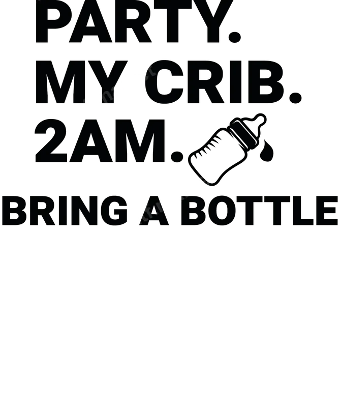 See allThis funny DTF transfer features the bold, playful text "PARTY. MY CRIB. 2AM. BRING A BOTTLE." accompanied by a cute baby bottle illustration. It perfectly captures the hilarious reality of a new parent's social life, making light of those late-night feeding sessions. This ready to press design is sure to bring a smile to anyone who sees it, transforming everyday apparel into a conversation starter. Ideal for new moms, dads, or anyone celebrating the arrival of a little one, this unique heat transfer makes an excellent gift. Perfect for baby showers, gender reveals, or as a thoughtful present for exhausted but loving parents. Use it to create personalized baby shower favors, family shirts, or even a clever announcement item. Applying this high-quality iron on transfer is simple with a heat press at 300-325°F for 15 seconds with medium pressure, or even a household iron for smaller designs. It's suitable for a wide range of materials, including cotton, polyester, and their blends. Forget about weeding; this heat press design comes ready to apply directly to your chosen garment. Our professional DTF transfer film ensures vibrant, crisp colors and exceptional durability. The design is crack-resistant, soft to the touch, and boasts a strong adhesive that will withstand countless washes. Get a professional finish every time with our premium apparel transfer, ensuring your funny message lasts as long as those 2 AM feedings.