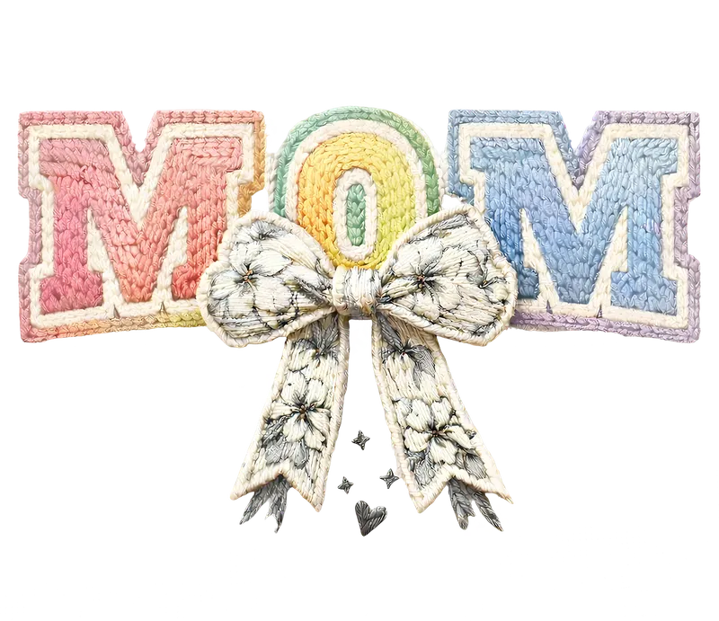 See allShow your love with this charming DTF transfer featuring "MOM" in a beautiful pastel knit texture. Letters boast soft, gradient colors – pink, yellow-green, blue – reminiscent of cozy, handmade crafts. A delicate floral bow, intricately detailed with an embroidered look, adorns the 'O', adding elegance. This ready to press design combines classic collegiate style with a gentle, feminine aesthetic, perfect for heartfelt gifts or personal apparel. This beautiful heat transfer is ideal for creating a special gift for your mother, grandmother, or any maternal figure. It's perfectly suited for Mother's Day, birthdays, baby showers for new moms, or everyday appreciation. Crafters, small business owners, and DIY enthusiasts will love adding this unique design to custom t-shirts, tote bags, aprons, and more, making memorable personalized items for family and friends. Applying this apparel transfer is a breeze, whether you use a professional heat press or a household iron. Our direct to film transfers work exceptionally well on a wide range of materials, including cotton, polyester, and various fabric blends. For best results, heat press at 300-325°F for 15 seconds with medium pressure, then cold peel the film. There's no tedious weeding required, making your crafting process quick and enjoyable. Experience premium quality with our DTF transfer. Each design is printed with vibrant, long-lasting colors that resist cracking and fading, ensuring your finished product looks great wash after wash. The professional-grade DTF film boasts a strong adhesive that bonds securely to your garment, leaving a soft, flexible feel that won't compromise comfort. Elevate your creations with a durable and stunning heat press design that truly stands out.