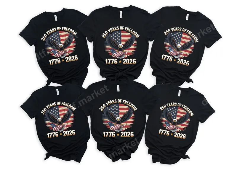 See allShow your American pride with this powerful DTF transfer celebrating "250 Years of Freedom" from 1776 to 2026. This eye-catching design features a majestic bald eagle with outstretched wings, clutching an American flag banner, set against a distressed red, white, and blue flag backdrop. It's a vibrant, ready to press direct to film transfer that brings historical significance and patriotism to any garment. This commemorative design is perfect for patriots, history enthusiasts, veterans, and anyone proud of American heritage. Ideal for celebrating Independence Day, the 4th of July, Memorial Day, Veterans Day, or the actual 250th anniversary in 2026. It makes a thoughtful gift for military families, history buffs, or as a statement piece for national holidays and historical events. Our heat press transfer is incredibly versatile, working seamlessly on cotton, polyester, and various fabric blends. Application is a breeze – simply use a heat press at 300-325°F for 15 seconds with medium pressure, or follow instructions for a household iron on transfer. There's no complex weeding or layering required, making customization quick and effortless. Experience professional-grade quality with this apparel transfer. Printed on premium DTF film, it offers exceptionally vibrant colors, excellent wash durability, and resistance to cracking or peeling. The soft-touch feel ensures maximum comfort, making your custom shirt design look and feel fantastic for years to come.