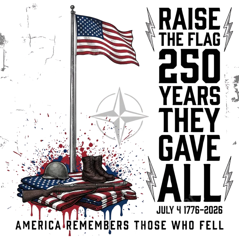See allThis powerful DTF transfer design commemorates 250 years of American independence and honors those who made the ultimate sacrifice. Featuring a waving American flag atop a pole, it captures the essence of patriotism. Below, a stack of respectfully folded flags, a military helmet, boots, and a rifle rest amidst a vibrant red and blue paint splatter, symbolizing sacrifice and remembrance. The bold text "RAISE THE FLAG 250 YEARS THEY GAVE ALL" and "AMERICA REMEMBERS THOSE WHO FELL" clearly convey the profound message. This ready to press design is perfect for creating impactful apparel. Ideal for veterans, military families, patriots, and history enthusiasts, this design is perfect for commemorating significant national holidays and events. Wear it proudly on Memorial Day, the 4th of July, Veterans Day, or any occasion where you wish to honor service and sacrifice. It makes a thoughtful gift for anyone who cherishes American history and remembers our fallen heroes. Applying this design is straightforward and efficient. Our heat press transfer works flawlessly on a wide variety of materials, including cotton, polyester, and their blends. For best results, use a heat press at 300-325°F for 15 seconds with medium pressure. It can also be applied with a household iron. Best of all, there's no weeding required, making your customization process quick and hassle-free. Crafted for durability and visual appeal, this apparel transfer ensures vibrant colors that resist cracking and peeling over time. The professional-grade DTF film provides a soft, flexible feel on your garment, moving with the fabric for maximum comfort. With strong adhesive properties, your design will stay securely in place, maintaining its high-quality look through countless washes.
