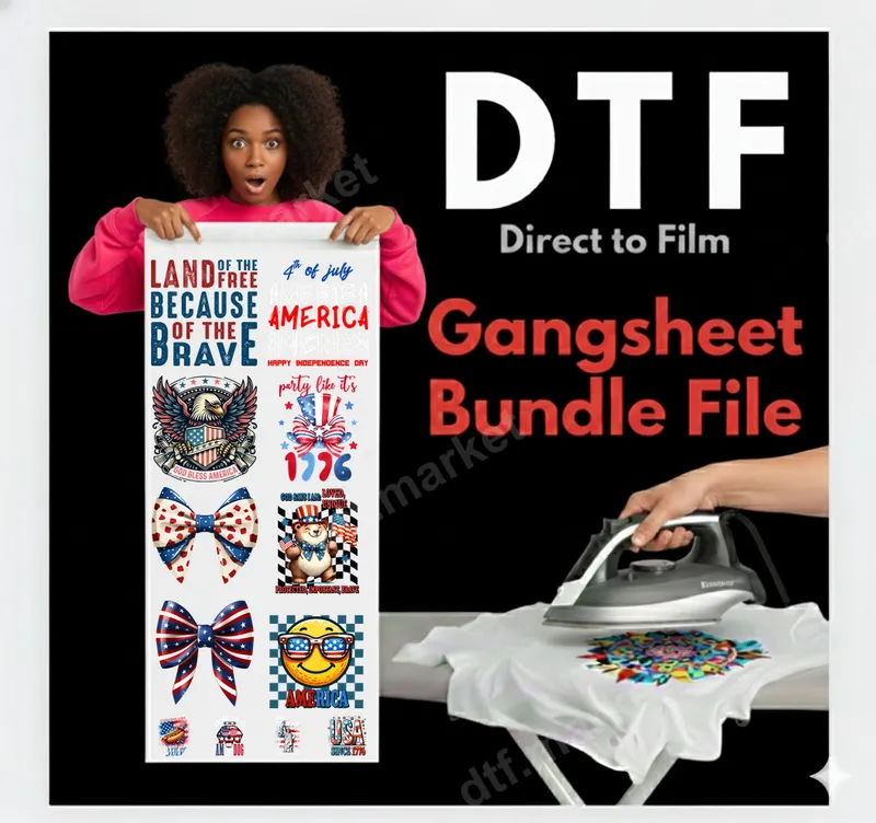 See allCelebrate with our patriotic DTF transfer gangsheet, perfect for the 4th of July and showcasing American pride. This ready to press collection features vibrant designs: classic American eagles, festive red, white, and blue bows, bold "AMERICA" typography, and fun graphics like a checkered-flag bear and a flag-sunglasses smiley. Each direct to film transfer offers crisp details for customizing apparel and accessories. These heat press designs are ideal for personalizing clothing for Independence Day, Memorial Day, Veterans Day, or everyday patriotic wear. Perfect for individuals or craft enthusiasts making custom t-shirts for family gatherings or themed parties. They also make thoughtful gifts for anyone proud of their national heritage. Applying these high-quality iron on transfers is simple. Our DTF transfers adhere beautifully to cotton, polyester, and various blends. Use a heat press at 300-325°F for 15 seconds with medium pressure for best results. A household iron can also be used (instructions included). Enjoy no weeding required, saving significant time on your projects. Experience superior quality with our professional-grade heat press ready transfers. Each apparel transfer boasts vibrant, long-lasting colors, excellent wash durability, and resistance to cracking or peeling. The specialized DTF film ensures a soft, flexible feel on your garment, unlike typical vinyl transfers. These shirt designs bond securely for a professional, durable finish.
