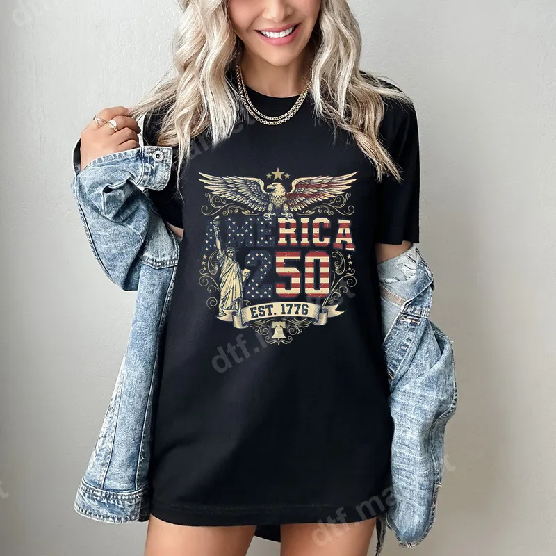 See allThis striking DTF transfer features a powerful bald eagle soaring above a distressed American flag backdrop, accompanied by a graceful Statue of Liberty silhouette. The design proudly displays "AMERICA 250 EST. 1776" in a vintage-inspired font, framed by elegant scrollwork and grounded by the iconic Liberty Bell. This ready to press design encapsulates the spirit of freedom and national pride, perfect for commemorating America's milestones. This high-quality iron on transfer is ideal for patriots, history enthusiasts, and anyone looking to express their American pride. It's perfect for celebrating national holidays like the Fourth of July, Memorial Day, and Veterans Day, or simply as everyday patriotic wear. This design also makes a thoughtful gift for military personnel, veterans, and history buffs, allowing them to personalize garments with a strong declaration of patriotism. Applying this heat transfer is simple and efficient, making it accessible for both professional printers and DIY crafters. It works beautifully on a wide range of materials, including cotton, polyester, and various fabric blends. For best results, apply with a heat press at 300-325°F for 15 seconds with medium pressure, followed by a cold peel. No weeding or intricate layering required, ensuring a hassle-free application process. Our professional DTF transfers are crafted using premium film and strong adhesive, delivering vibrant colors and crisp details that truly stand out. The finished design is soft to the touch, incredibly durable, and highly resistant to cracking or fading, ensuring your custom t-shirt transfer looks fantastic wash after wash. Elevate your apparel with this iconic piece of Americana.