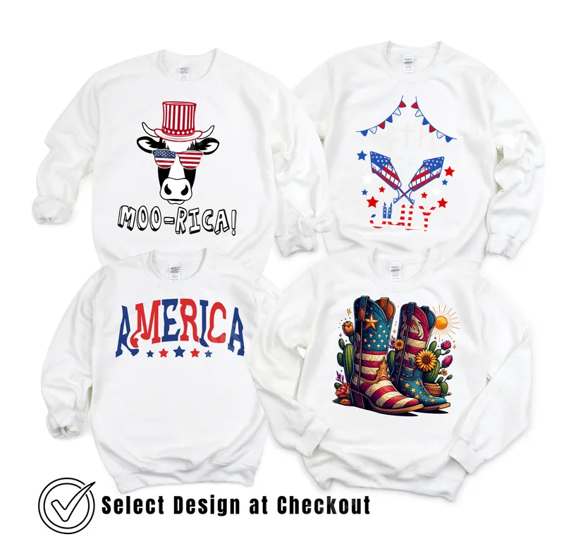 See allThis collection features four vibrant patriotic DTF transfer designs perfect for celebrating American pride. Choose from a sassy "Moo-Rica!" cow wearing a top hat and flag sunglasses, an explosive fireworks display with "4th of July" text, a bold "AMERICA" typography design with stars, or a charming pair of cowboy boots adorned with the American flag amidst desert cacti and sunflowers. Each direct to film transfer is ready to press, bringing a festive and spirited touch to any garment. These versatile heat press designs are ideal for anyone looking to showcase their patriotism, especially for the 4th of July, Memorial Day, Labor Day, or any national holiday. Perfect for family gatherings, BBQ parties, parades, or as thoughtful gifts for friends and fellow patriots. Crafters, small business owners, and DIY enthusiasts will love the ease of creating custom apparel for seasonal sales or personal wear. Applying these high-quality iron on transfers is simple and hassle-free. Our heat press ready transfers work beautifully on a wide range of fabrics including 100% cotton, polyester, and various blends. For best results, use a heat press at 300-325°F for 15 seconds with medium pressure. These apparel transfers can also be applied with a household iron, offering flexibility for all users. Enjoy the convenience of no weeding or masking required. Each DTF transfer boasts brilliant, fade-resistant colors and exceptional detail, ensuring your finished garment stands out. Made with premium DTF film, these durable heat transfers are designed to be crack-resistant, peel-resistant, and incredibly soft to the touch, providing a comfortable wear. Experience professional-grade results with strong adhesive that bonds securely to your fabric, making your custom t-shirt or bag last wash after wash.