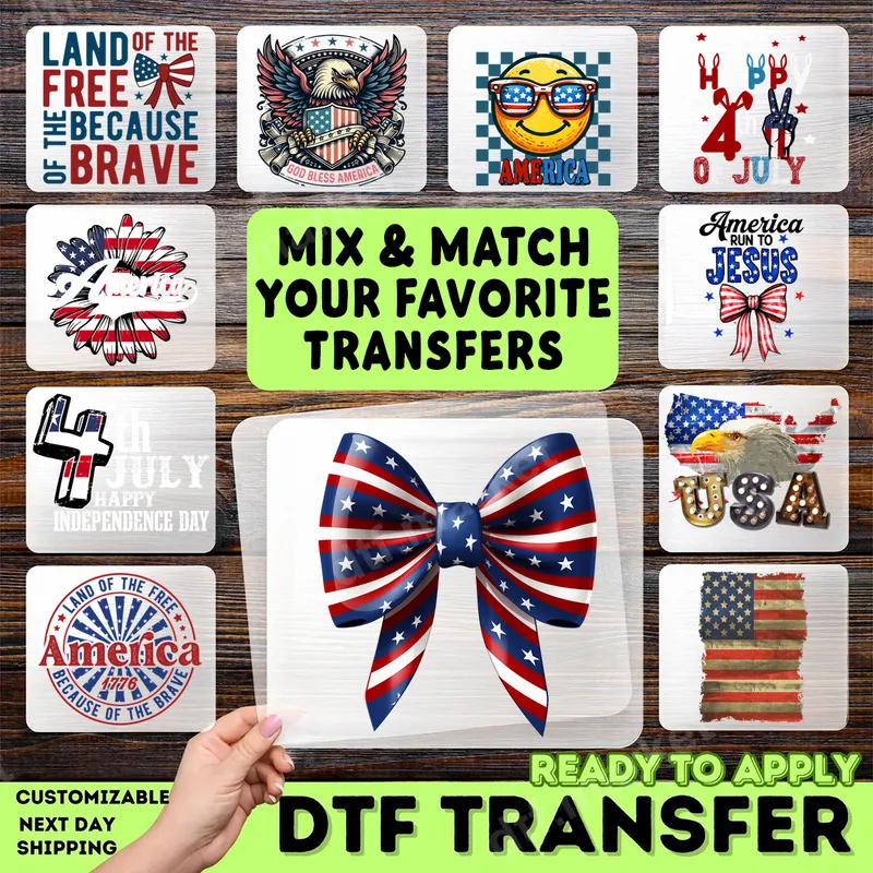 See allThis eye-catching patriotic bow DTF transfer features classic American flag colors, with bold red and white stripes and scattered white stars on a vibrant blue background. It's a cheerful and festive design, perfect for showcasing your national pride with a touch of charm. This high-quality ready to press transfer offers a seamless way to customize your apparel. Ideal for anyone celebrating national holidays, supporting patriotic events, or simply expressing their love for the USA. This heat transfer design is perfect for Fourth of July parties, Memorial Day gatherings, Labor Day picnics, or daily wear. It makes a fantastic gift for friends, family, or anyone who cherishes American spirit and patriotism. Our versatile DTF transfers work beautifully on a wide range of materials, including cotton, polyester, and various fabric blends. Applying this ready to press transfer is quick and easy with a standard heat press, typically at 300-325°F for 15 seconds with medium pressure. For home crafters, it can also be applied with a household iron. No tedious weeding is required, saving you time. Experience superior quality with our durable heat press designs. Each apparel transfer boasts vibrant, crisp colors that resist cracking and fading, ensuring your customized items look great wash after wash. The professional-grade DTF film provides a soft, flexible feel that seamlessly integrates with the garment, while the strong adhesive ensures a long-lasting bond. Get a professional finish every time with our premium iron on decals.