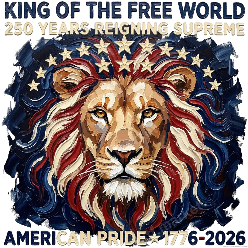 See allThis powerful DTF transfer showcases a majestic lion with a richly textured, American flag-inspired mane, crowned with stars. Above the lion, the bold declaration "KING OF THE FREE WORLD" and "250 YEARS REIGNING SUPREME" assert a strong message of liberty and enduring strength. Below, "AMERICAN PRIDE 1776-2026" grounds the design in a proud historical timeline. This artistic direct to film transfer is ready to press, featuring a vibrant, palette knife-style artwork that brings depth and character to any garment. This striking design is perfect for patriots, veterans, military families, and anyone who cherishes American values. It's an ideal heat press design for celebrating national holidays like the 4th of July, Memorial Day, and Veterans Day, or for showing your national spirit at patriotic events and rallies. It also makes a thoughtful and impactful gift for history enthusiasts or those who take deep pride in their country. Elevate your wardrobe with a symbol of strength, freedom, and two and a half centuries of American excellence. Applying this heat transfer is straightforward, making it accessible for both experienced crafters and beginners. It adheres perfectly to a wide range of fabrics including cotton, polyester, and their blends. For best results, use a heat press at 300-325°F for 15 seconds with medium, even pressure. No weeding is required – simply press and peel! While a heat press is recommended for professional results, this versatile iron on transfer can also be applied with a high-quality household iron, following similar temperature and pressure guidelines. Our professional-grade DTF transfers are renowned for their exceptional quality. This ready to press transfer ensures vibrant, fade-resistant colors and intricate details that won't crack or peel over time. The innovative film technology provides a soft, lightweight feel on your garment, ensuring maximum comfort and durability. Experience the ease of creating professional-looking apparel with our premium heat press ready designs, offering superior stretch and washability for lasting wear.