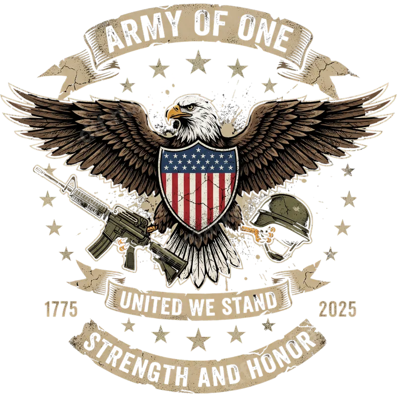 See allUnleash your inner patriot with this striking 'Army Of One' DTF transfer. This powerful design features a majestic bald eagle with an American flag shield, flanked by an M4 carbine rifle and a military helmet. Banners proudly declare 'Army Of One,' 'United We Stand,' and 'Strength And Honor,' all rendered with a rugged, distressed texture that enhances its vintage appeal. This high-quality direct to film transfer is ready to press, allowing you to instantly customize your apparel with a bold statement of American pride and military respect. This versatile heat transfer is perfect for active military personnel, veterans, military spouses, and patriotic Americans who want to display their allegiance. It's an excellent choice for holidays like the 4th of July, Memorial Day, Veterans Day, or any day you want to honor the brave. Create unique gifts for fathers, grandfathers, or any supporter of our armed forces. Its commanding presence makes it ideal for community events, political rallies, or simply as a proud everyday garment design. Applying this vibrant iron on transfer is straightforward. Our premium DTF transfers adhere beautifully to a wide range of fabrics, including cotton, polyester, and cotton-poly blends. For best results, use a heat press at 300-325°F for 15 seconds with medium, even pressure. Unlike traditional vinyl transfer methods, there's absolutely no weeding required, saving you time and effort. Simply peel and press for a professional finish every time. Experience exceptional quality with our professional-grade DTF transfers. Each t-shirt transfer is meticulously printed to ensure vibrant, true-to-life colors that resist cracking and peeling, even after multiple washes. The final design feels soft and lightweight on the fabric, providing superior comfort and durability. With our high-quality DTF film and strong adhesive, you can trust that your custom apparel transfer will stand the test of time, reflecting your unwavering patriotism.