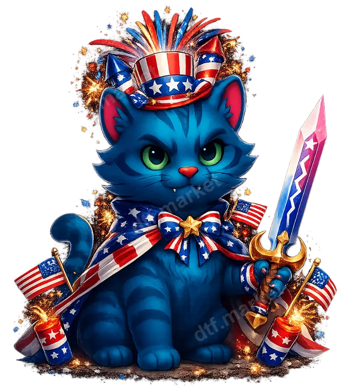 See allCelebrate your American spirit with this vibrant Patriotic Cat DTF transfer! This adorable blue feline, complete with an Uncle Sam hat, an American flag cape, and a matching sword, is surrounded by festive fireworks. It’s a whimsical design that blends national pride with playful charm. Our high-quality DTF transfer is ready to press, making it simple to personalize your garments with a truly unique look. Perfect for cat lovers, patriots, and anyone expressing USA pride, this design is ideal for national holidays. Whether you're attending a 4th of July barbecue, honoring heroes on Memorial Day, or celebrating Labor Day, this iron on transfer makes a fantastic statement. It's also a thoughtful gift for friends and family who cherish both their country and their feline companions. Applying this heat transfer is simple, yielding professional results on 100% cotton, polyester, and cotton-poly blends. For best results, use a heat press at 300-325°F for 15 seconds with medium, even pressure. A household iron can also be used. The greatest benefit? No weeding required, saving you significant time and effort! Experience the superior quality of our professional DTF film. This t-shirt transfer boasts incredibly vibrant colors, crisp details, and exceptional durability that resists cracking and peeling, even after multiple washes. The print feels soft to the touch, seamlessly integrating with the fabric. With its strong adhesive properties, your new apparel transfer will stay put, ensuring your patriotic cat design looks fantastic for years. Get yours today!
