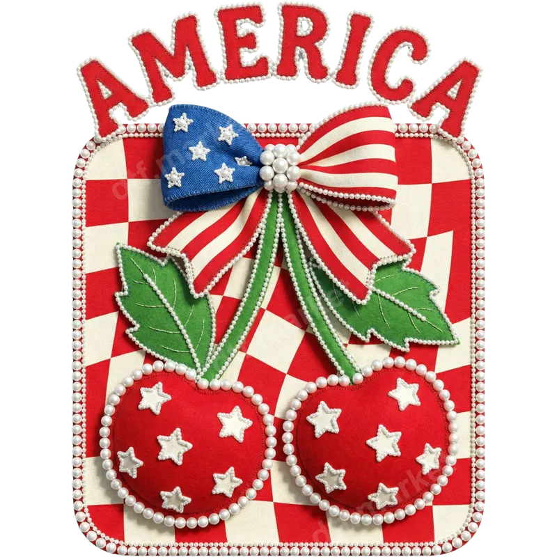 See allDive into patriotic charm with this unique "America" cherry DTF transfer. This eye-catching design features the word "AMERICA" boldly declared, adorned with a festive red, white, and blue bow, and two sweet cherries embellished with stars, all outlined in elegant pearls. The classic red and white checkerboard background adds a delightful vintage-americana feel. This ready to press transfer is perfect for showcasing national pride with playful elegance. This versatile heat press design is ideal for anyone celebrating national holidays. Perfect for the 4th of July, Memorial Day, Labor Day, or everyday patriotic wear, it makes an excellent gift. Crafters and small business owners will find this iron on decal a fantastic addition, offering a charming custom transfer option. Applying your new apparel transfer is a breeze! This professional-grade DTF transfer works beautifully on cotton, polyester, and blends. Use a heat press at 300-325°F for 15 seconds with medium pressure for best results. It's a truly "ready to press" solution, requiring no weeding, saving time compared to traditional vinyl transfers. Expect exceptional quality with this heat press transfer. Our transfers boast vibrant, long-lasting colors that resist cracking, peeling, and fading, ensuring your design looks fantastic wash after wash. The graphic is soft to the touch, seamlessly integrating with fabric. Printed on professional DTF film with strong adhesive, it guarantees a durable, high-quality finish every time.