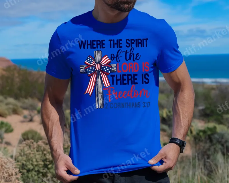 See allThis vibrant direct to film (DTF) transfer showcases a powerful message of faith and freedom. The design features a rustic wooden cross adorned with an American flag-patterned bow, symbolizing spiritual belief and national pride. Emblazoned with the scripture 'WHERE THE SPIRIT of the LORD IS THERE IS Freedom' from 2 Corinthians 3:17, this ready to press transfer is perfect for expressing deeply held values. Bold black, striking red, and classic blue and white give it a timeless, impactful appeal. This inspirational design is ideal for devout Christians, patriots, and anyone who cherishes liberty's spiritual foundations. It makes a thoughtful gift for pastors, veterans, or family members on patriotic holidays like the 4th of July, Memorial Day, or Veterans Day. Beyond special occasions, it’s perfect for everyday apparel, allowing wearers to proudly display their faith and love for country. It's also suitable for church groups or community events. Our high-quality heat press transfer applies seamlessly to cotton, polyester, and various blends. For best results, use a heat press at 300-325°F for 15 seconds with medium pressure, then peel cold. While a heat press is recommended for professional results, this iron on transfer can also be applied with a household iron. The beauty of DTF transfers is that there’s no weeding required, saving you time and effort. Experience superior quality with our durable direct to film transfers. Each t-shirt transfer is meticulously printed to ensure vibrant, true-to-life colors that pop on any garment. The specialized DTF film ensures a soft hand feel that flexes with the fabric, resisting cracks and peels even after multiple washes. Our heat press designs utilize a strong adhesive, guaranteeing a long-lasting, professional finish on all custom apparel. Create stunning garments with ease and confidence.