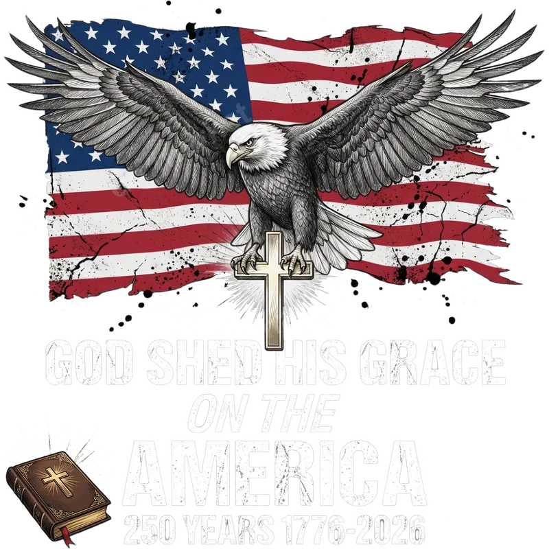 See allThis powerful DTF transfer showcases a majestic bald eagle soaring over a distressed American flag, clutching a golden cross, embodying deep faith and patriotism. The inspiring text 'GOD SHED HIS GRACE ON THE AMERICA 250 YEARS 1776-2026' with an open Bible accentuates the nation's spiritual foundation and upcoming anniversary. This ready to press design is perfect for celebrating American values with a bold, meaningful statement. This heat press design is ideal for anyone who cherishes their faith and country. It’s perfect for patriotic holidays like Independence Day, Veterans Day, or Memorial Day, as well as church events or political rallies. A thoughtful gift for veterans, active military, pastors, devout Christians, or anyone proud of America's heritage and the upcoming 250th anniversary. Use this iron on transfer to create unique apparel for family and friends. Our premium heat transfer works flawlessly on a wide range of fabric types, including cotton, polyester, and various blends. Applying this shirt design is simple: use a heat press at 300-325°F for 15 seconds with medium pressure, or follow instructions for a household iron. Enjoy professional results without the hassle of weeding, making custom apparel creation quick and easy. This high-quality apparel transfer ensures a seamless application every time. Experience vibrant colors, exceptional durability, and a soft-to-touch finish with our DTF transfers. Made with professional-grade DTF film and strong adhesive, this design is built to withstand countless washes without cracking or fading. Elevate your garments with a long-lasting, high-quality ready to press transfer that truly makes a statement about your beliefs.