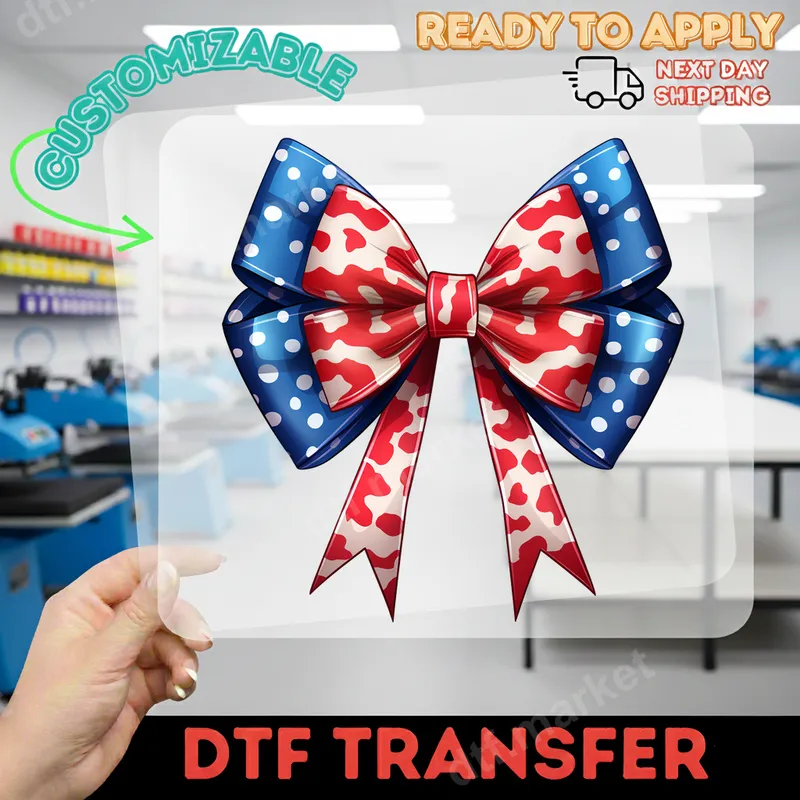 See allThis eye-catching DTF transfer features a beautifully rendered bow design, combining classic red, white, and blue with a rustic cow print and playful polka dots. It’s a perfect blend of American pride and country charm, ready to press onto your favorite garments. This vibrant heat transfer design ensures a stunning, detailed image for all your DIY apparel projects. Ideal for anyone who loves patriotic themes, country western flair, or wants to showcase their unique style for holidays like the 4th of July, Memorial Day, or Labor Day. This versatile iron on transfer makes a fantastic gift for friends and family, perfect for rodeo events, country concerts, or just everyday wear. Create custom apparel for mom, daughters, or fellow enthusiasts with ease. Applying this direct to film transfer is straightforward and hassle-free. It’s designed for easy application with a heat press at 300-325°F for 15 seconds with medium pressure, or can even be applied with a household iron on most fabrics like cotton, polyester, and their blends. Forget about weeding; this ready to press transfer saves you time and effort, delivering professional results without the fuss. Our DTF transfers are known for their exceptional quality, offering vibrant colors that pop and a soft-to-touch feel that won't crack or peel. Each heat press design is printed on professional-grade DTF film with strong adhesive, ensuring durability and longevity. Enjoy a superior t-shirt transfer that stands up to washes and wear, making your custom creations truly last.