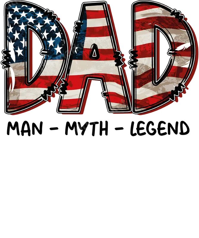 See allThis bold DTF transfer proudly features the word 'DAD' in a distressed American flag pattern, outlined with a rugged, stitched effect. Below, the classic phrase 'MAN - MYTH - LEGEND' completes the design, celebrating the heroic dads in your life. This striking heat press ready design is perfect for creating unique apparel that stands out, embodying strength, patriotism, and paternal pride. Ideal for Father's Day gifts, birthdays for dads, grandfathers, or any father figure. This versatile heat transfer is also excellent for patriotic holidays like the 4th of July, Memorial Day, or Veterans Day, allowing you to showcase American pride. It's a fantastic choice for family gatherings, casual wear, or creating custom iron on decals for military families and proud American dads. Applying this ready to press transfer is simple and efficient. It adheres beautifully to a wide range of fabric types, including cotton, polyester, and blends. For best results, use a heat press at 300-325°F for 15 seconds with medium pressure, then peel cold. While a heat press is recommended, a household iron can also be used. Enjoy the convenience of no weeding, making apparel decoration quick and easy. Experience exceptional quality with our direct to film transfers. Each t-shirt transfer boasts vibrant colors, superior stretchability, and excellent wash durability, ensuring your design remains crack-resistant and soft to the touch. Made with professional-grade DTF film and strong adhesive, these apparel transfers are designed for longevity, providing a premium finish that feels lightweight and looks fantastic on any garment.