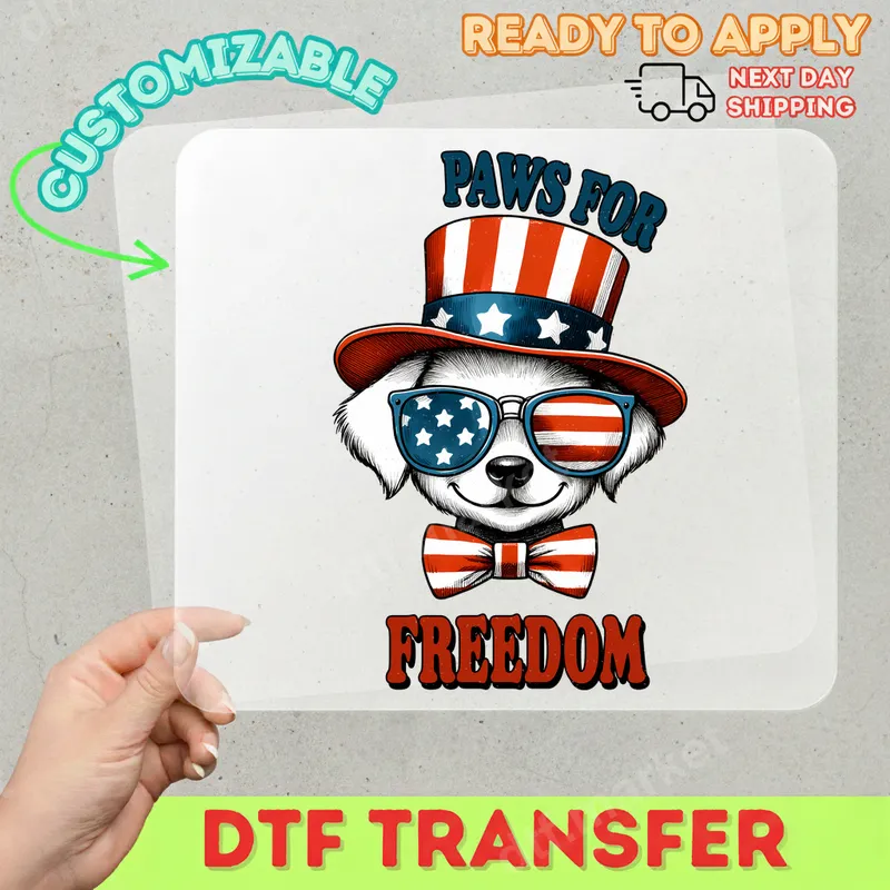 See allThis vibrant DTF transfer features an adorable patriotic dog, proudly sporting an Uncle Sam hat, star-spangled sunglasses, and a matching bowtie. The design is accompanied by the heartwarming phrase "Paws for Freedom," making it a perfect tribute to liberty and our furry friends. This high-quality direct to film transfer is ready to press, bringing a festive and charming American spirit to any garment or accessory. It's an ideal choice for anyone looking to express their patriotism with a cute, unique touch. This delightful heat press design is perfect for dog owners, patriots, and anyone celebrating national holidays. Ideal for the Fourth of July, Memorial Day, Veterans Day, or simply showing off American pride year-round. It makes a fantastic gift for friends and family who love dogs and cherish freedom. Create custom apparel for family gatherings, parades, barbecues, or everyday wear with this eye-catching iron on decal. Our professional ready to press transfer is incredibly versatile and can be applied to a wide range of fabric types, including cotton, polyester, and various blends. For best results, use a heat press at 300-325°F for 15 seconds with medium pressure. It can also be applied with a household iron, following included instructions. The process is simple, requiring no weeding or intricate layering, making it easy for beginners and experienced crafters alike. Experience superior quality with this durable and soft-to-the-touch t-shirt transfer. Our DTF prints boast vibrant colors that pop and resist cracking, peeling, or fading, ensuring your custom creation looks fantastic for a long time. Each apparel transfer is crafted using professional-grade DTF film and strong adhesive, providing excellent wash durability. Get a professional finish every time and enjoy long-lasting wear.