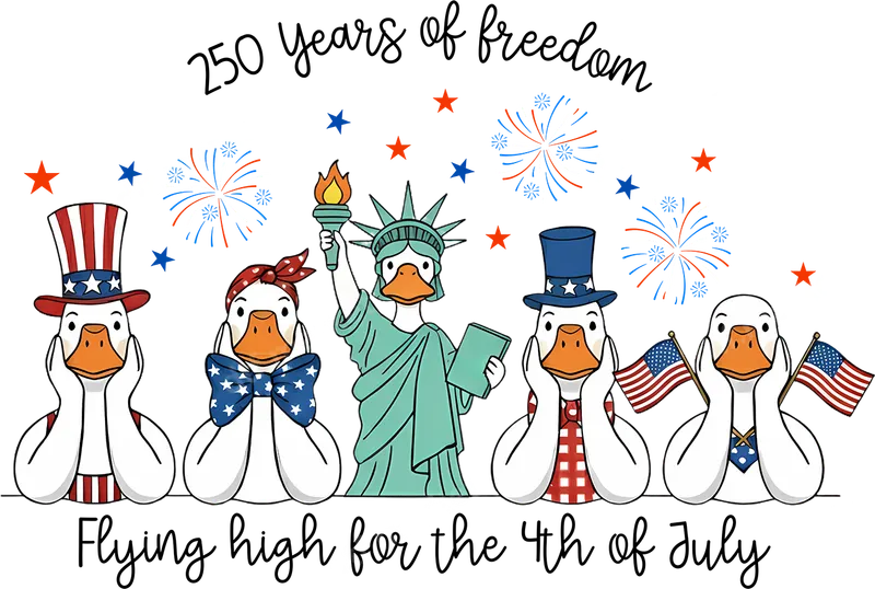 See allCelebrate Independence Day with our adorable Patriotic Ducks DTF transfer! This vibrant design showcases five charming ducks in festive American attire, including a Statue of Liberty duck and others waving American flags, surrounded by fireworks and stars. The text '250 years of freedom' and 'Flying high for the 4th of July' makes this a whimsical tribute to America. This ready to press transfer is perfect for all your patriotic apparel. This cheerful heat press design is ideal for anyone showcasing American pride with a fun, unique flair. Perfect for families at 4th of July parades, BBQs, fireworks, or summer gatherings. Crafters, small business owners, and patriots will love creating custom t-shirts, tote bags, and accessories. It also makes a fantastic gift for friends and family who appreciate cute animal designs and national holidays. Our high-quality apparel transfer applies flawlessly to cotton, polyester, and most fabric blends. For best results, use a heat press at 300-325°F for 15 seconds with medium pressure, then cool peel. While a heat press is recommended, this durable iron on decal can also be applied with a household iron. Enjoy hassle-free application with no weeding or layering required. Experience superior print quality with our premium DTF transfers. Each image boasts vibrant colors and sharp details, ensuring your apparel stands out. The design is crack-resistant, fade-resistant, and soft to the touch, feeling like part of the fabric. Our professional-grade DTF film and strong adhesive guarantee a long-lasting, durable finish that will withstand countless washes, making your custom transfer a cherished item.