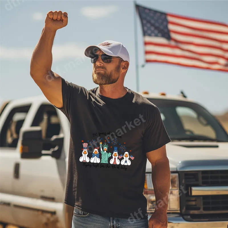 See allThis festive DTF transfer features a charming line-up of patriotic ducks, ready to celebrate 250 years of freedom. Each whimsical duck is adorned in iconic American symbols, including Uncle Sam hats, the Statue of Liberty, and mini American flags, all set against a backdrop of celebratory fireworks and stars. The design proudly proclaims "Flying high for the 4th of July," capturing the joyful spirit of independence. This ready to press design is perfect for adding a touch of Americana fun to any garment. Ideal for anyone looking to showcase their American pride with a playful twist, this heat press transfer is a must-have for Independence Day celebrations, Memorial Day gatherings, or any patriotic event. It makes a fantastic gift for friends and family who love unique Americana designs, duck enthusiasts, or those planning festive outfits for parades and barbecues. Create matching family shirts or personalized gifts with ease using this vibrant apparel transfer. Our premium DTF transfers are incredibly versatile, adhering beautifully to a wide range of fabrics including cotton, polyester, and cotton/poly blends. Application is straightforward: simply use a heat press at 300-325°F for 15 seconds with medium pressure, or apply with a household iron. Unlike traditional vinyl, there's no tedious weeding required, making your crafting process quick and enjoyable. Transform blank garments into custom creations in minutes. Experience superior quality with our direct to film transfer technology. These transfers boast incredibly vibrant colors that pop, offering excellent wash durability and resistance to cracking or peeling. The final design feels soft to the touch, seamlessly integrating with the fabric. Each heat press design is printed on professional-grade DTF film with a strong, reliable adhesive, ensuring a long-lasting and professional finish for all your custom projects.