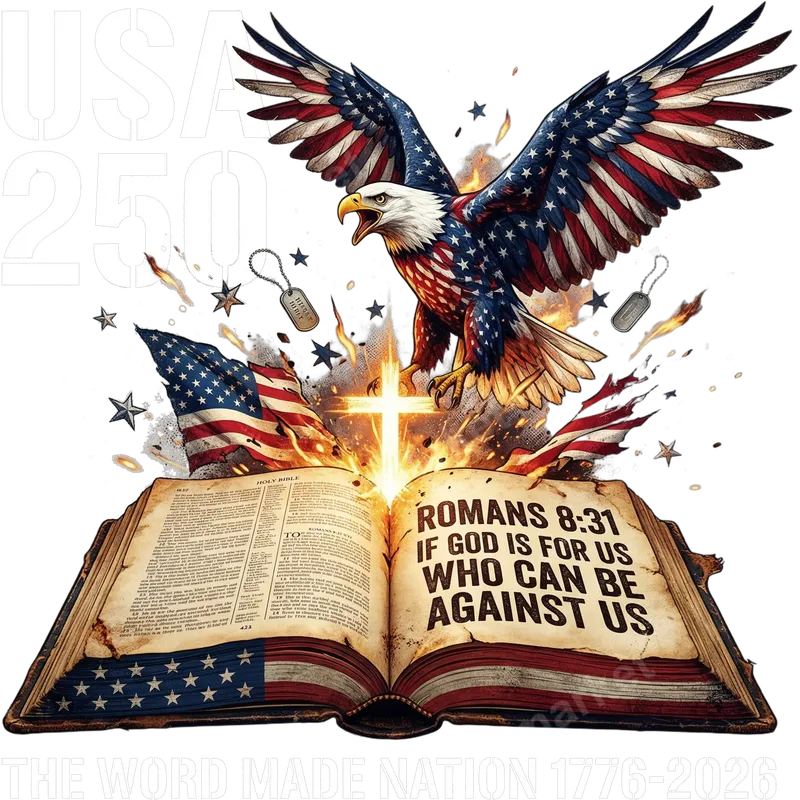 See allCelebrate faith and freedom with this striking DTF transfer, featuring a majestic bald eagle adorned with the American flag, soaring above an open Holy Bible. The scripture Romans 8:31, "IF GOD IS FOR US WHO CAN BE AGAINST US," is prominently displayed, flanked by a radiant cross and a flowing US flag. Subtle elements like military dog tags and explosive sparks add to its powerful and inspiring vibe, commemorating "USA 250" and "THE WORD MADE NATION 1776-2026." This ready to press design is a bold statement of American pride and unwavering spiritual conviction. This powerful heat transfer is perfect for patriots, devout Christians, military families, and history enthusiasts. It makes an excellent statement piece for celebrations like the 4th of July, Memorial Day, and Veterans Day, or for everyday wear to express your values. It’s also an incredibly thoughtful gift for those who cherish both their country and their faith, offering a unique way to mark the upcoming USA 250th anniversary in 2026. Applying this heat press transfer is straightforward, making it ideal for custom apparel projects. It adheres beautifully to a wide range of fabrics, including cotton, polyester, and their blends. Simply use a heat press at 300-325°F for 15 seconds with medium pressure, or apply it easily with a household iron. Forget the hassle of weeding; this iron on transfer is designed for quick and flawless application, providing a professional finish every time. Our professional-grade direct to film transfer ensures a vibrant, high-definition image that stands the test of time. Crafted on durable DTF film with a strong adhesive, this apparel transfer is resistant to cracking and peeling, maintaining its vivid colors wash after wash. The design boasts a soft, lightweight feel, making it comfortable to wear and perfect for creating personalized t-shirt transfers that look and feel premium.
