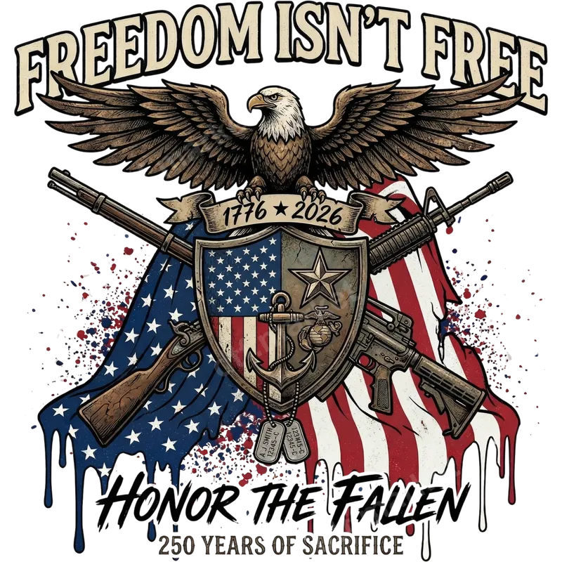 See allThis powerful DTF transfer features a majestic bald eagle with spread wings, soaring above a distressed American flag backdrop. The design proudly displays crossed firearms—a vintage musket and a modern rifle—flanking a detailed shield. The shield incorporates the US flag, a star, an anchor, a Marine Corps emblem, and military dog tags. Emblazoned with "FREEDOM ISN'T FREE" and "HONOR THE FALLEN 250 YEARS OF SACRIFICE (1776 * 2026)," this ready to press design is a profound tribute to American heroes and the enduring cost of liberty. The vibrant colors and intricate details make this an impactful graphic. This patriotic heat transfer is ideal for veterans, active military personnel, first responders, and anyone who wants to honor the sacrifices made for freedom. It’s perfect for commemorating Memorial Day, Veterans Day, the 4th of July, or any patriotic event. Use it to create meaningful gifts for family members, friends, or comrades who share a deep respect for service and country. Show your American pride and remembrance on various apparel items, making a powerful statement wherever you go. Our high-quality iron on transfer is incredibly versatile and easy to apply. Designed for a wide range of fabrics, it works flawlessly on cotton, polyester, and cotton-poly blends. Achieving a professional finish is simple with a heat press: apply at 300-325°F for 15 seconds with medium pressure. For home users, a household iron can also be used with careful application. Best of all, there's no weeding required, saving you time and effort. Just press and wear! Experience superior quality with this professional-grade t-shirt transfer. Our DTF film ensures vibrant colors that resist cracking and peeling, maintaining their brilliance wash after wash. The soft-touch finish means your decorated garment remains comfortable to wear, without the heavy, stiff feel of traditional transfers. With strong adhesive properties, this apparel transfer will seamlessly integrate into your fabric, providing a durable and lasting design that truly honors its message.