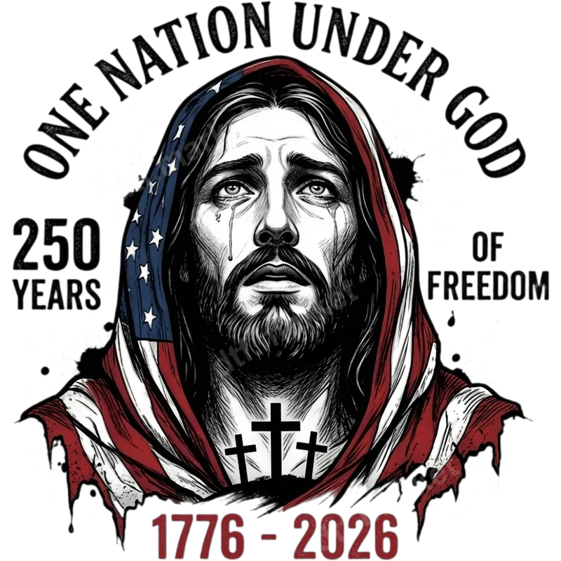 See allThis powerful DTF transfer features a poignant illustration of Jesus Christ, his face showing deep emotion, draped in the Stars and Stripes of the American flag. Below him, three crosses stand, symbolizing sacrifice and faith, while the design is framed by the impactful declaration "ONE NATION UNDER GOD" and "250 YEARS OF FREEDOM 1776-2026." This ready to press design evokes a strong sense of patriotic faith and reflection on American history, making a profound statement. This moving heat press transfer is ideal for individuals who want to express their Christian faith and American patriotism. It's perfect for celebrations like the 4th of July, Memorial Day, or any occasion honoring national heritage and spiritual values. An excellent gift idea for veterans, church groups, or anyone who deeply values the foundational principles of the United States. Use this iron on transfer to create meaningful apparel for yourself or loved ones. Our high-quality direct to film transfer is designed for effortless application on a wide range of materials, including cotton, polyester, and various fabric blends. Achieve professional results using a heat press set at 300-325°F for just 15 seconds with medium pressure. No specialized weeding is required, making your customization process quick and clean. It’s also suitable for application with a household iron with careful technique for a crisp shirt design. Every apparel transfer is produced with vibrant, long-lasting inks that resist cracking and peeling, ensuring your designs look great wash after wash. The soft-touch finish integrates seamlessly with fabric, providing comfort and durability. Our professional-grade DTF film offers superior adhesive properties, guaranteeing a crisp, detailed design that stands the test of time, reflecting your devotion and pride.