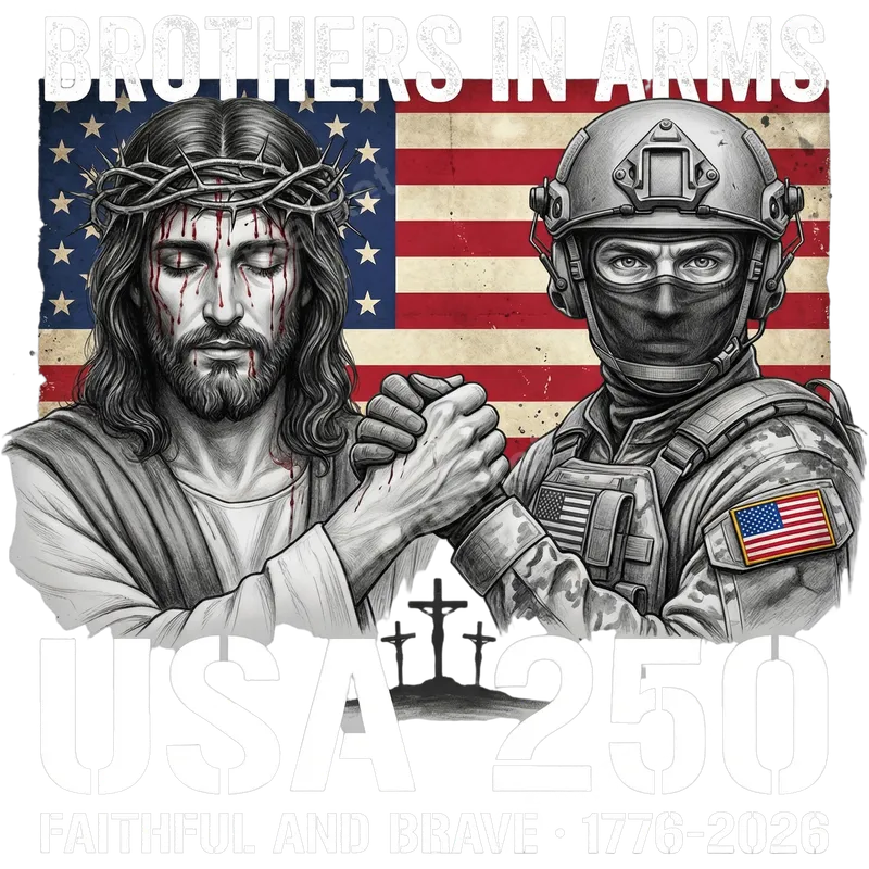 See allEmbrace a powerful symbol of faith and patriotism with our 'Brothers in Arms' DTF transfer. This striking design features Jesus Christ, wearing a crown of thorns, alongside a resolute tactical soldier, their hands clasped in a gesture of unity. Behind them, a distressed American flag proudly waves, complemented by the text 'USA 250' and 'FAITHFUL AND BRAVE • 1776-2026'. This ready to press transfer masterfully blends spiritual devotion with national pride, making it a compelling graphic for any garment. This unique heat press design is perfect for military families, veterans, proud Americans, and devout Christians. Commemorate the USA's 250th anniversary in 2026, celebrate patriotic holidays like the 4th of July, or simply express your values daily. It makes an impactful gift for Father's Day, Memorial Day, or as a personal statement piece, honoring both spiritual belief and service to country. Applying this versatile iron on transfer is effortless. Our high-quality DTF transfers are compatible with a wide range of fabrics, including cotton, polyester, and their blends, making it ideal for various apparel projects. Simply use a standard heat press at 300-325°F for 15 seconds with medium pressure. Unlike traditional vinyl transfers, there's no weeding required, saving you time and effort for a professional finish. Experience vibrant, long-lasting results with this professional apparel transfer. The colors are rich and true to the design, ensuring your garment stands out. Our premium DTF film is engineered for exceptional durability, offering a crack-resistant finish that feels soft to the touch. Enjoy a superior quality heat press ready transfer that will endure countless washes without fading or peeling, maintaining its powerful message for years.
