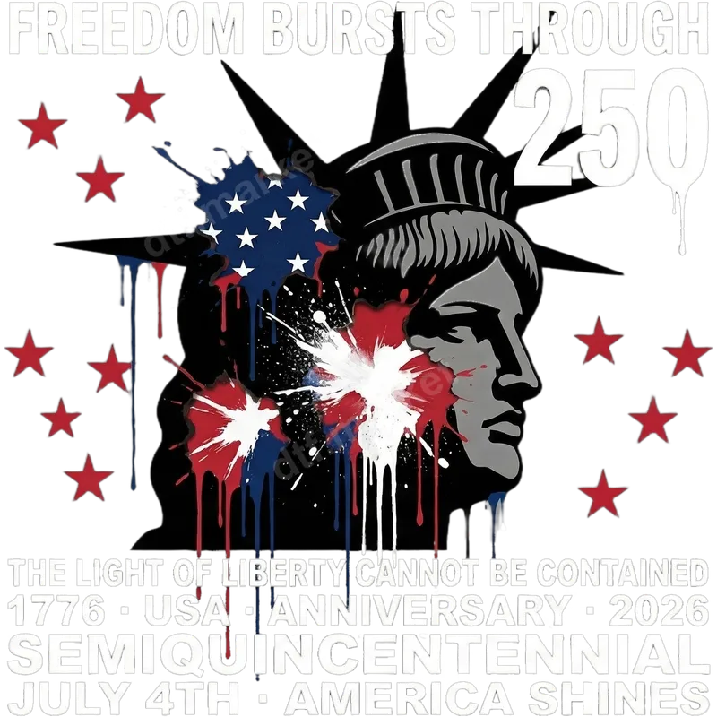 See allCommemorate a momentous occasion with this striking Statue of Liberty DTF transfer, celebrating the USA's 250th Semiquincentennial. The design features a stylized profile of Lady Liberty adorned with dynamic red, white, and blue paint splatters, evoking the American flag. Bold text like "FREEDOM BURSTS THROUGH 250" and "SEMIQUINCENTENNIAL 1776 · USA · ANNIVERSARY · 2026" highlights the upcoming milestone. This ready to press design is perfect for expressing national pride with a modern, edgy aesthetic. This unique apparel transfer is ideal for patriotic Americans, history enthusiasts, and anyone looking to celebrate the nation's 250th anniversary in 2026. It makes a fantastic custom gift for July 4th, Memorial Day, Veterans Day, or any event honoring American heritage. Showcase your pride on game days, parades, or everyday wear with this distinctive t-shirt transfer that truly stands out. Applying this DTF transfer is effortless, suitable for a wide range of fabrics including cotton, polyester, and their blends. For best results, use a heat press at 300-325°F for 15 seconds with medium pressure, then perform a cool peel. While a professional heat press transfer is recommended, a household iron can also be used with care. There's no complex weeding or layering required, making customization quick and easy. Crafted using high-quality DTF film and vibrant, durable inks, this heat press design ensures a professional finish that lasts. Our transfers are crack-resistant, soft to the touch, and maintain their brilliant colors wash after wash. Enjoy a strong adhesive that bonds seamlessly to your chosen garment, providing a long-lasting, high-quality decorative element that celebrates America's enduring spirit.