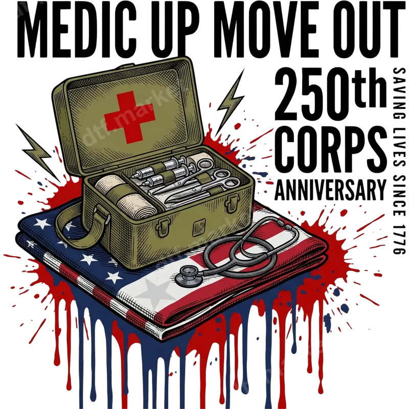 See allShow your unwavering support for military medics with this powerful 'Medic Up Move Out' DTF transfer. This patriotic design features a vintage-style open medic box, complete with essential medical instruments and the iconic red cross, resting atop a folded American flag. Splashes of red and blue give it a dynamic, ready-for-action feel, commemorating the 250th Corps Anniversary. This high-quality DTF transfer is ready to press, allowing you to create custom apparel with ease. This unique design is perfect for current and former military medics, healthcare heroes, veterans, and anyone proud of our nation's life-savers. Ideal for Veterans Day, Memorial Day, Fourth of July celebrations, military appreciation events, or as a thoughtful gift for those in the medical field. Honor the dedication and courage of the US Army Medical Corps with this meaningful heat transfer design. Our durable iron on transfer works seamlessly on a wide range of fabrics, including cotton, polyester, and various blends. For best results, apply with a heat press at 300-325°F for 15 seconds with medium, even pressure. This user-friendly heat press design requires no weeding, saving you time and effort. While a heat press is recommended for professional results, a household iron can also be used with careful application. Experience superior quality with our vibrant, crack-resistant apparel transfer. Each design is printed on professional-grade DTF film, ensuring crisp details and brilliant colors that last. The transfers offer a soft, smooth feel on your garment, making them comfortable to wear. Create professional-looking t-shirts, hoodies, bags, and more that stand the test of time and wear with this premium custom transfer.