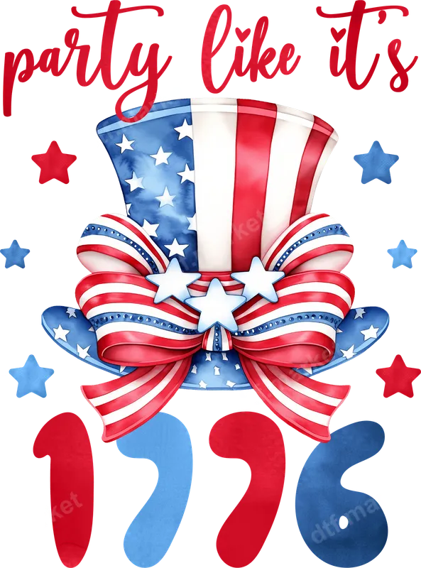 See allThis vibrant DTF transfer captures a festive, patriotic spirit with its "Party Like It's 1776" slogan. Featuring a charming Uncle Sam style top hat adorned with stars and stripes in a watercolor aesthetic, this ready to press design is surrounded by scattered red and blue stars, creating a lively and celebratory feel. It's the perfect statement piece for showing off your American pride with a playful, historical nod. This striking design is ideal for anyone looking to express their patriotism, from history enthusiasts and proud Americans to those celebrating Independence Day, Memorial Day, or any national holiday. It makes a fantastic custom transfer for family gatherings, BBQ parties, or as a unique gift for friends who love American history. Infuse a touch of retro Americana into your wardrobe with this fun heat press design. Our high-quality direct to film transfers are incredibly versatile and easy to apply to a wide range of materials, including cotton, polyester, and various fabric blends. For best results, use a heat press at 300-325°F for 15 seconds with medium pressure, then cold peel. Alternatively, a household iron can be used with careful application. Enjoy the convenience of a no-weeding iron on transfer that's ready to go. Experience the exceptional quality of our DTF transfers. Each heat transfer boasts vibrant, crisp colors and a soft, smooth feel that stands up to repeated washes without cracking or fading. Crafted using professional-grade DTF film and strong adhesive, these apparel transfers ensure a durable, long-lasting finish on any garment. Transform your t-shirts, sweatshirts, and bags with ease and confidence.