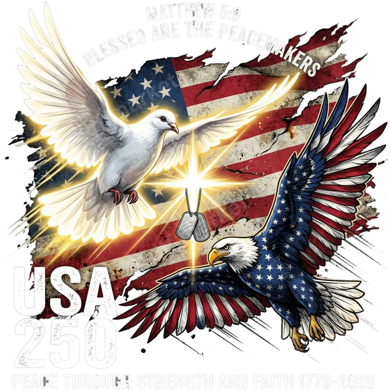 See allEmbrace a powerful message of peace and patriotism with this striking DTF transfer design. It features a majestic bald eagle with American flag wings soaring alongside a radiant white dove, symbolizing peace and faith. Glowing dog tags hang from a luminous cross-like element, all set against a distressed Stars and Stripes background. The design includes 'MATTHEW 5:9 BLESSED ARE THE PEACEMAKERS', 'USA 250', and 'PEACE THROUGH STRENGTH AND FAITH 1776-2026', offering a profound ready to press heat transfer honoring service and spirituality. This unique heat press design is ideal for veterans, active military, first responders, and their families. It's also perfect for anyone cherishing American values, Christian faith, and the pursuit of peace. Celebrate Independence Day, Memorial Day, Veterans Day, or the upcoming USA 250th anniversary. This versatile iron on transfer makes an excellent gift for patriots, spiritual individuals, or those committed to community service and freedom. Applying your new shirt design is simple. Our high-quality apparel transfer works beautifully on cotton, polyester, and blends. For best results, use a heat press at 300-325°F for 15 seconds with medium pressure. A household iron can also be used. Unlike vinyl transfers, there's no weeding required, saving you time and effort for a professional finish. Experience exceptional quality with our direct to film transfer. Each design boasts vibrant colors, superior detail, and a soft-to-the-touch finish. Engineered for durability, our transfers are crack-resistant and designed to withstand countless washes without fading or peeling. Made with professional-grade DTF film and a strong adhesive, you're guaranteed a long-lasting, high-quality heat press ready design that truly stands out.
