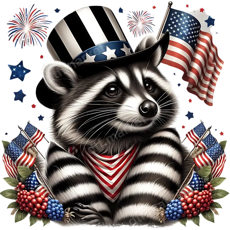 See allShow your American pride with this charming patriotic raccoon DTF transfer. This delightful design features a cute raccoon sporting a classic Uncle Sam top hat and a festive red, white, and blue bandana, surrounded by vibrant fireworks, waving American flags, and patriotic berries. It’s a whimsical and spirited ready to press transfer that perfectly captures the festive mood of national celebrations, making it an ideal choice for anyone looking to add a touch of patriotic flair to their wardrobe. This adorable heat press design is perfect for families, animal lovers, and anyone celebrating Independence Day, Memorial Day, or Veterans Day. It makes a fantastic gift for friends and relatives who enjoy unique patriotic apparel or want to stand out at summer barbecues, parades, and themed parties. Elevate your everyday style or prepare for special occasions with this unique animal-themed celebration of America, perfect for creating custom shirts and accessories. Our direct to film transfer is designed for easy application on a wide range of fabrics, including cotton, polyester, and various blends. For best results, use a heat press at 280-300°F (138-149°C) with medium pressure for 6-10 seconds, then peel instantly. This iron on transfer can also be applied with a household iron with careful technique. Enjoy the convenience of a professional-grade apparel transfer with no weeding required, making your crafting projects quick and fun. Experience exceptional quality with our DTF transfers, known for their vibrant colors, incredible detail, and crack-resistant finish. The soft-to-touch feel ensures maximum comfort, while the strong adhesive guarantees long-lasting durability through countless washes. This premium heat transfer provides a professional look that will make your garments stand out, bringing joy and a patriotic spirit wherever you go.