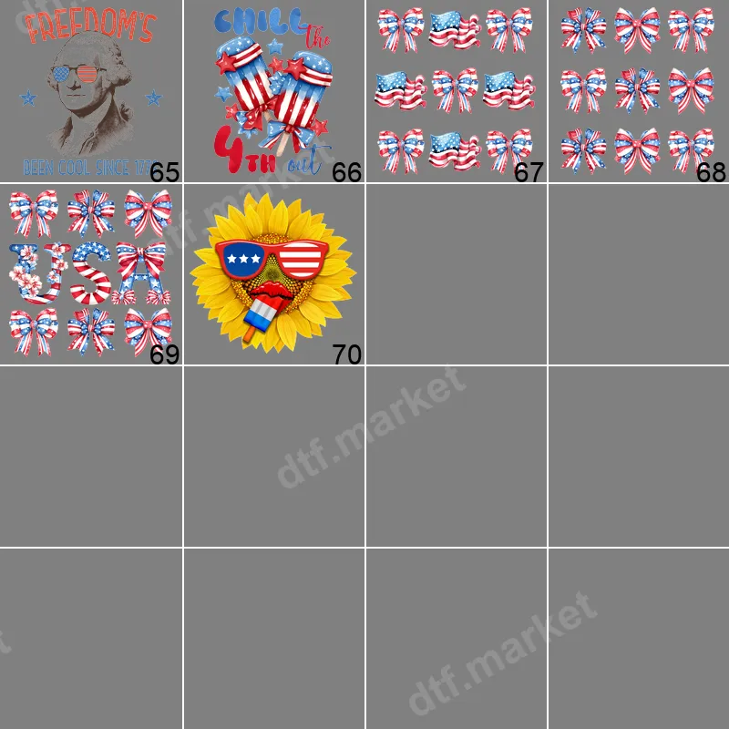 See allThis vibrant DTF transfer features a cheerful sunflower sporting cool American flag sunglasses and a sassy red-lipped smile, complete with a patriotic ice pop. It's a whimsical and fun design, perfect for celebrating national holidays or simply adding a touch of Americana to your wardrobe. This high-quality, ready to press heat transfer combines summery vibes with a patriotic flair, making it an eye-catching statement piece for any garment. Ideal for anyone looking to express their patriotic pride with a unique twist, this design is perfect for 4th of July festivities, Memorial Day celebrations, or Labor Day picnics. It makes an excellent iron on transfer for crafting enthusiasts, small business owners creating custom apparel, or as a thoughtful gift for friends and family who love unique Americana designs. Embrace the spirit of summer and country with this charming design. Our direct to film transfers are incredibly versatile and can be applied to a wide range of fabrics, including cotton, polyester, and various blends. Applying this heat press design is simple: use a heat press at 300-325°F for 15 seconds with medium pressure, or a household iron for equally great results. There’s no weeding involved, making your custom apparel projects quick and hassle-free from start to finish. Experience professional-grade results with our premium DTF transfer. Printed on high-quality DTF film with strong adhesive, this apparel transfer ensures vibrant colors that pop, superior durability, and resistance to cracking or peeling after washing. The finished design feels soft to the touch, seamlessly integrating with your garment for a professional and long-lasting look that rivals traditional screen printing.