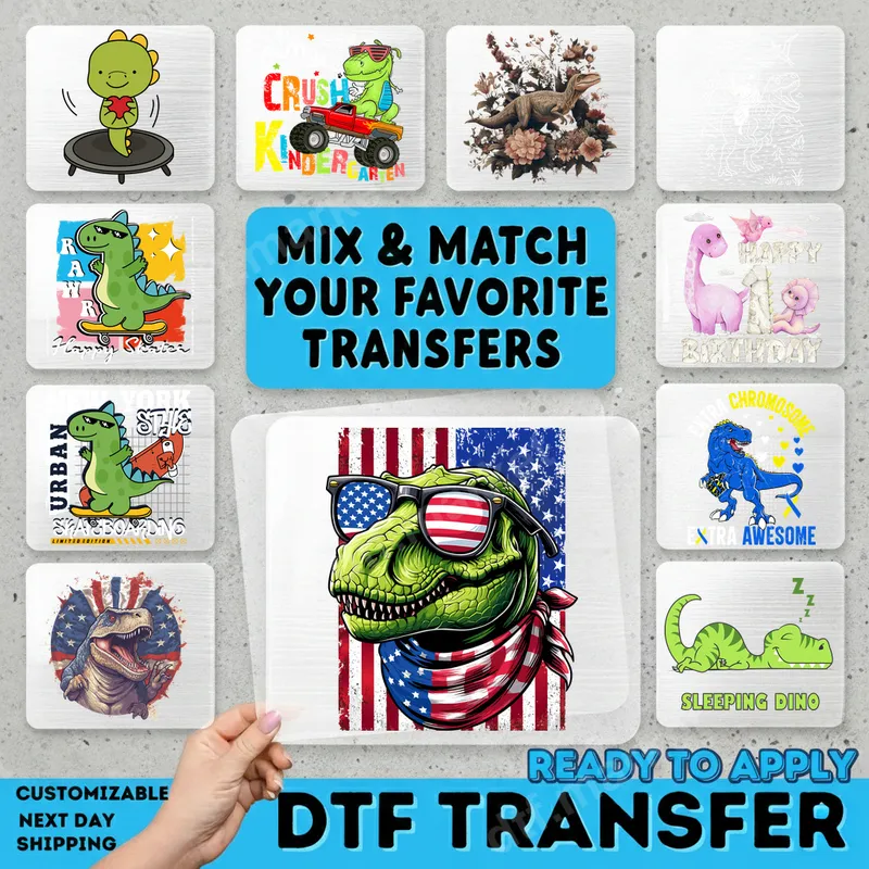 See allUnleash your inner patriot with this striking T-Rex DTF transfer, showcasing a cool dinosaur sporting American flag sunglasses and a matching bandana. This vibrant, detailed design features the T-Rex head set against a distressed American flag background, blending prehistoric power with national pride. It's a truly unique ready to press transfer that stands out. This fierce and festive design is perfect for anyone who loves dinosaurs, America, or both! Ideal for celebrating the 4th of July, Memorial Day, Veterans Day, or simply showing off your patriotic spirit year-round. It makes an excellent gift for dinosaur enthusiasts, veterans, or anyone looking for a unique t-shirt transfer to personalize their wardrobe. Applying this heat press ready design is effortless. Our premium direct to film transfers adhere beautifully to a wide range of fabrics including 100% cotton, polyester, and cotton/poly blends. Use a heat press at 300-325°F for 15 seconds with medium pressure, or easily apply with a household iron. Forget the hassle of weeding; simply press and peel for a perfect finish every time. Experience professional quality with every iron on transfer. Our DTF transfers boast vibrant colors, exceptional durability, and a soft-hand feel that won't crack or fade. Made with high-quality DTF film and strong adhesive, this apparel transfer ensures a long-lasting, professional-grade finish on all your garments and accessories.