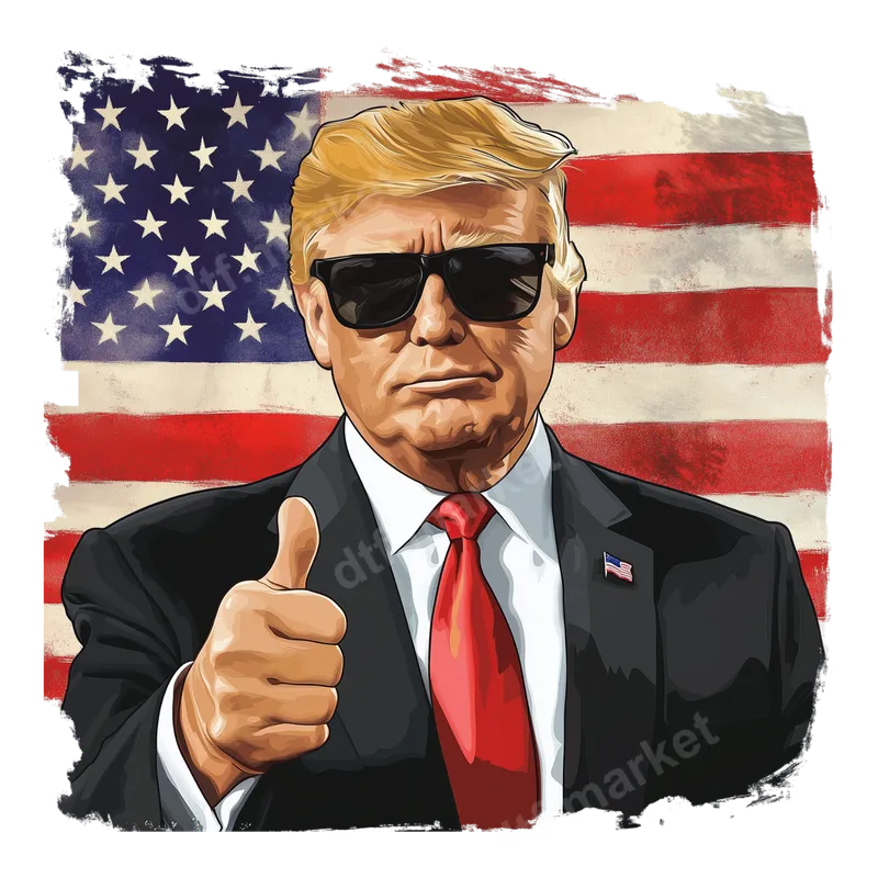 See allShow your unwavering support with this bold Donald Trump DTF transfer. The design features a stylized depiction of Trump wearing his signature suit and sunglasses, giving a confident thumbs-up. Behind him, a distressed American flag creates a powerful, patriotic backdrop. This high-quality direct to film transfer is ready to press, making it easy to customize your apparel and accessories. Perfect for political rallies, election events, or simply expressing your views, this heat transfer is ideal for Trump supporters, patriots, and anyone proud of their American heritage. It makes a fantastic gift for friends and family during election season, national holidays like the 4th of July, or as unique everyday wear to make a statement. Applying this heat press design is a breeze. Our iron on transfer works beautifully on a wide range of materials, including cotton, polyester, and various fabric blends. For best results, use a heat press at 280-300°F for 6-10 seconds with medium pressure and an instant peel. No heat press? A household iron can also be used, making this ready to press transfer accessible for everyone. Plus, there’s no tedious weeding required! Experience superior quality with our professional DTF film. This t-shirt transfer boasts vibrant colors that pop, is crack-resistant, and feels incredibly soft to the touch once applied. The strong adhesive ensures your design stays put, offering lasting durability and a professional finish that will stand the test of time and washes. Create custom apparel that truly reflects your patriotism.