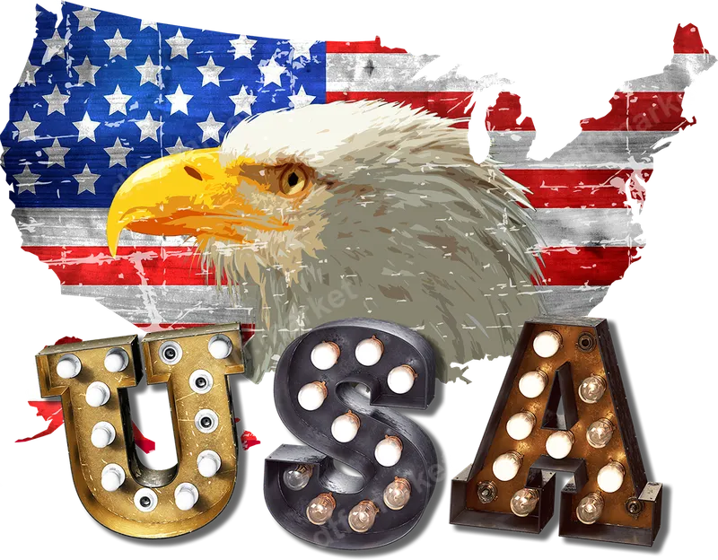 See allThis striking DTF transfer showcases a powerful expression of American pride. It features a distressed U.S. map, rendered in the iconic red, white, and blue of the American flag, serving as a backdrop to a majestic bald eagle. In the foreground, the letters "USA" are creatively depicted in a vintage marquee style, illuminated as if by classic bulb lights, adding a touch of nostalgic flair. This ready to press transfer combines rustic patriotism with a classic aesthetic, perfect for making a bold statement. This heat press design is ideal for anyone looking to celebrate their love for America, from veterans and active military personnel to patriots and those attending national holidays. It's perfect for Fourth of July celebrations, Memorial Day gatherings, Veterans Day events, or everyday wear to show off your national spirit. It also makes an excellent gift for family members, friends, or anyone who cherishes American values and heritage. Applying this iron on transfer is simple and efficient. It adheres beautifully to a wide range of fabric types, including cotton, polyester, and various blends, making it versatile for many projects. For best results, use a heat press at 300-325°F for 15 seconds with medium pressure. This design is a true ready to press transfer, meaning there's absolutely no weeding required, saving you time and effort. You can even apply it with a household iron, though results may vary. Crafted with professional-grade DTF film, this t-shirt transfer boasts vibrant colors that pop and excellent durability. The inks are designed to be crack-resistant, ensuring your design looks fantastic wash after wash. The finished heat transfer is soft to the touch, integrating seamlessly with your garment without feeling bulky or stiff. Experience premium quality and long-lasting adherence with every apparel transfer from dtf.market.