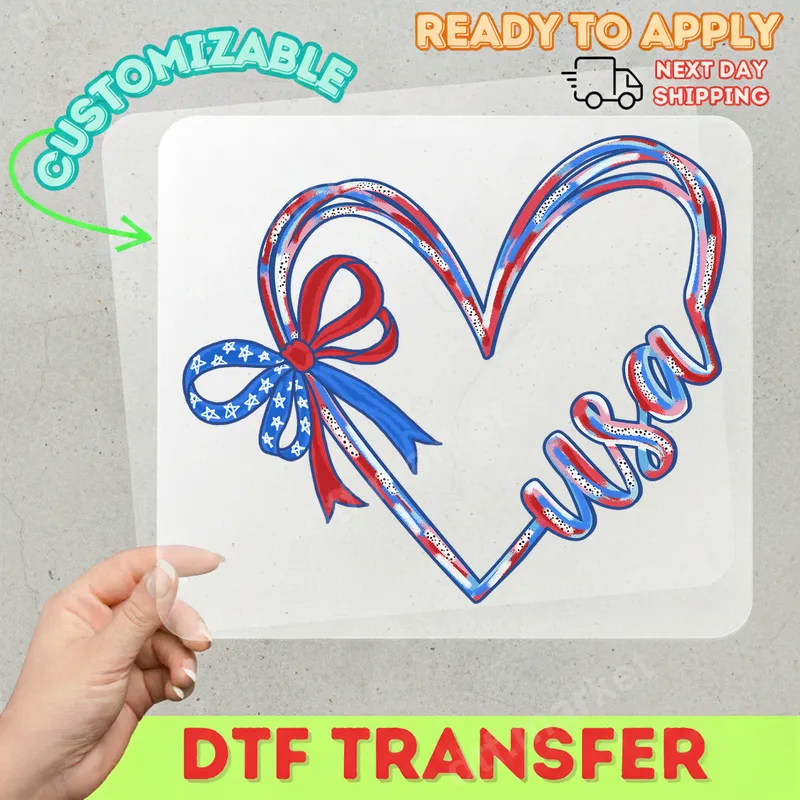 See allCelebrate your American spirit with our striking Patriotic USA Heart Bow DTF transfer. This vibrant design features a beautifully rendered heart, artfully intertwined with the word 'USA' in bold red, white, and blue hues. A charming bow, adorned with stars, adds a touch of classic Americana to the left side, completing this compelling symbol of national pride. Our heat press ready design arrives pre-printed on high-quality film, ensuring a seamless application process for your next creative project. This versatile heat transfer is ideal for anyone looking to display their love for the United States. Perfect for patriotic holidays like the Fourth of July, Memorial Day, or Veterans Day, it’s also a fantastic way to show national pride year-round. Crafters, small business owners, and individuals creating custom apparel will find this design perfect for gifting to military families, veterans, or anyone with a deep connection to their country. Make a statement at parades, sporting events, or family gatherings with this iconic symbol. Applying your new iron on transfer is incredibly simple. This ready to press transfer works beautifully on a wide range of fabrics, including cotton, polyester, and various blends. For best results, use a heat press at 300-325°F for 15 seconds with medium pressure, then peel cold. You can also achieve great results with a household iron, following included instructions. Forget tedious weeding; our DTF technology means your design is cut precisely and ready for immediate application, saving you time and effort. Each apparel transfer is produced with professional-grade DTF film, ensuring vibrant colors that pop and a soft, flexible feel that seamlessly integrates with your garment. Unlike traditional vinyl transfers, our designs boast superior stretch and crack resistance, maintaining their crisp appearance even after numerous washes. The strong adhesive backing ensures a long-lasting bond, giving your custom creations a durable, high-quality finish you'll be proud to wear or sell. Experience the difference of premium DTF heat press designs.