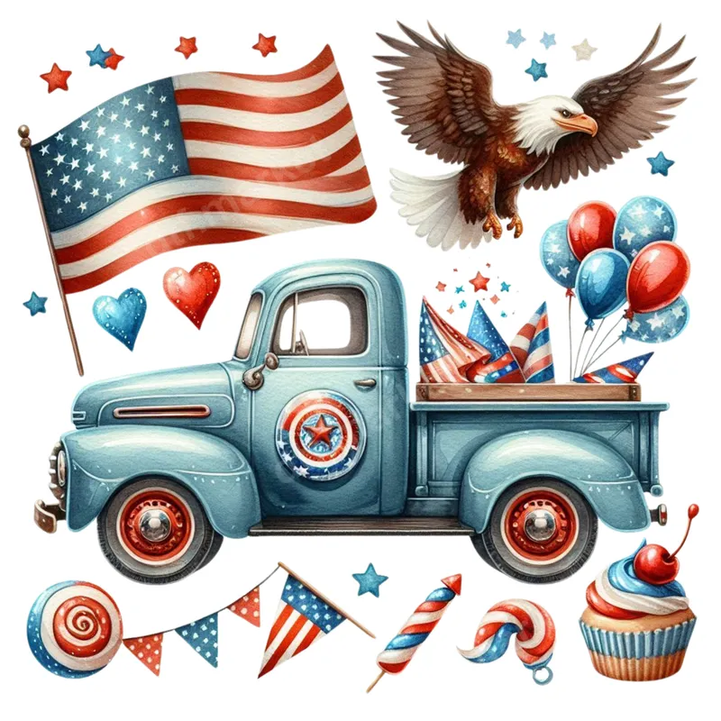 See allThis charming design captures the spirit of American celebration with a vintage blue pickup truck, proudly adorned with patriotic flair. Featuring a waving American flag, a majestic bald eagle in flight, festive balloons, firecrackers, and a delicious cupcake, this image is bursting with red, white, and blue. It's the perfect ready to press DTF transfer to infuse your apparel with a touch of classic Americana and joyful patriotism, ready to make a statement. Ideal for anyone who loves their country, vintage vehicles, or simply enjoys celebrating national holidays, this heat press transfer is incredibly versatile. It's a fantastic choice for creating custom shirts for Fourth of July parties, Memorial Day events, Veterans Day tributes, or any patriotic gathering. Crafters, small business owners, and DIY enthusiasts will find this iron on transfer perfect for unique gifts or personal projects, adding a distinctive touch to any wardrobe. Applying this premium apparel transfer is straightforward and hassle-free, designed for maximum convenience. Our DTF transfers work beautifully on a wide range of materials, including cotton, polyester, and various fabric blends. For best results, use a heat press at 280-300°F for 6-10 seconds with medium pressure, then instantly peel the film. No intricate weeding is required, making your customization process quick and efficient, whether you're using a professional press or a household iron. Crafted with exceptional quality, this direct to film transfer boasts incredibly vibrant colors that pop and sharp details that last. Engineered to be crack-resistant and offer a soft, comfortable feel on your garment, it ensures a professional finish every time. Made with durable DTF film and a strong adhesive, your new shirt design will withstand countless washes, maintaining its integrity and patriotic charm for years to come.