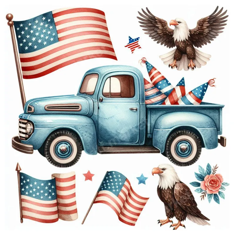 See allImmerse yourself in Americana with this charming watercolor patriotic DTF transfer, perfect for celebrating national pride. This vibrant ready to press design features a classic vintage blue pickup truck, proudly displaying a large American flag. Surrounding elements include majestic bald eagles, additional waving flags, and festive red, white, and blue party hats in the truck bed, all rendered in a beautiful, artistic style that evokes a sense of rustic charm and celebration. This versatile heat press design is ideal for anyone looking to showcase their American spirit for holidays or everyday wear. It’s perfect for commemorating the 4th of July, Memorial Day, Veterans Day, or any patriotic event. Small business owners can create unique merchandise, while individuals can personalize gifts for veterans, service members, or family members. This apparel transfer allows for easy customization of various garments and accessories. Applying your new patriotic iron on transfer is simple and efficient. It works seamlessly on a wide range of fabrics, including cotton, polyester, and their blends. For best results, use a heat press at 280-300°F (138-149°C) for 6-10 seconds with medium pressure, then perform an instant peel. For home crafters, a household iron can also be used with careful application following included instructions. Best of all, there's absolutely no weeding required, saving you time and effort. Experience professional-grade quality with this direct to film transfer. Each design boasts vibrant, true-to-color hues that resist cracking and fading, ensuring your finished product looks fantastic wear after wear. The transfer feels soft to the touch once applied and is crafted using premium DTF film with a strong, durable adhesive for long-lasting results, making it a reliable choice for all your custom creations.