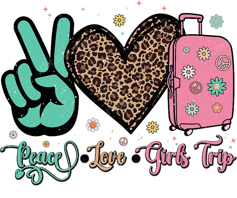 See allThe "Peace Love Girls Trip" DTF transfer brings a fun, retro vibe to any garment. This eye-catching design features a cool teal peace sign hand, a stylish leopard print heart, and a vibrant pink suitcase adorned with playful daisies and peace symbols. The distressed texture throughout gives it an authentic vintage feel. It's a high-quality, ready to press direct to film transfer, perfect for adding a touch of personality to your apparel quickly and easily. This cheerful design is tailor-made for your next girls' trip, bachelorette party, or any adventure with your besties. Imagine matching "iron on" t-shirts for a memorable weekend getaway, cruises, or road trips! It also makes a fantastic gift for friends who love to travel, celebrating friendship and shared experiences. Perfect for creating custom apparel for sorority events, family vacations, or just everyday fun. Applying this heat press design is a breeze. Our premium heat transfer works perfectly on a wide range of fabrics, including cotton, polyester, and various blends. For best results, use a heat press at 300-325°F for 15 seconds with medium pressure. It's also suitable for application with a household iron, making DIY customization accessible to everyone. Forget about weeding or layering; this ready-to-press transfer saves you time and effort. Experience the superior quality of our professional DTF transfers. This apparel transfer boasts incredibly vibrant colors that pop, ensuring your design looks stunning. It's designed to be durable, crack-resistant, and flexible, maintaining its integrity wash after wash. The soft-touch finish ensures comfort, unlike stiff vinyl transfers. Our film and adhesive provide strong adherence for a long-lasting, professional-looking garment.