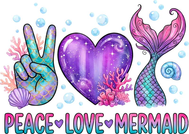 See allThis whimsical "Peace Love Mermaid" design captures the enchanting spirit of the ocean. It features a dazzling peace sign hand adorned with shimmering mermaid scales in aqua and lavender, a cosmic purple heart sparkling with stars, and a graceful mermaid tail in vibrant coordinating hues. Coral, seashells, and playful bubbles complete this magical underwater scene. This premium DTF transfer is ready to press, bringing an instant splash of fantasy and positivity to any garment or accessory. Ideal for mermaid lovers and ocean enthusiasts, this direct to film transfer makes a fantastic gift for birthdays, summer vacations, or beach trips. Create matching t-shirts for a mermaid-themed party, unique tote bags, or personalized hoodies for your favorite ocean adventurer. It's especially popular with young girls, teens, and women embracing their inner siren. Applying this heat press transfer is incredibly easy and requires no weeding, unlike traditional vinyl transfer designs. It adheres beautifully to cotton, polyester, and various blends, making it versatile for countless projects. For best results, use a heat press at 300-325°F for 15 seconds with medium pressure, followed by a cold peel. A household iron can also be used for a smooth, professional finish every time. Crafted from high-quality professional DTF film, this iron on transfer boasts incredibly vibrant colors and sharp details that truly pop. The design is soft to the touch, crack-resistant, and designed to withstand numerous washes without fading. Enjoy long-lasting, commercial-grade results with every heat press ready design.