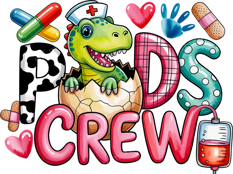 See allThis vibrant "PEDS CREW" DTF transfer showcases an irresistibly cute baby dinosaur, wearing a nurse's hat and hatching from an egg. Surrounded by playful medical elements like colorful pills, hearts, band-aids, and an IV bag, this design perfectly embodies the cheerful spirit of pediatric healthcare. The "PEDS" letters feature diverse, fun patterns, while "CREW" uses a bubbly pink font, making this a truly eye-catching, ready to press design. This charming heat transfer is ideal for pediatric nurses, doctors, and all dedicated PEDS crew members. It's a fantastic way to display team spirit in children's hospitals or clinics. This iron on transfer also makes a thoughtful gift for nursing school graduates, National Nurses Week, or as appreciation for any healthcare hero. Our high-quality direct to film transfer applies easily to cotton, polyester, and blends. Achieve professional results using a heat press at 300-325°F for 15 seconds with medium pressure. For home crafters, a household iron can also be used. Enjoy the convenience of a ready to press design with absolutely no weeding required, saving valuable time on your custom apparel. Experience the superior quality of our DTF transfers. This t-shirt transfer boasts incredibly vibrant, crack-resistant colors that remain soft to the touch. Made with professional DTF film and strong adhesive, this heat press design ensures flawless adhesion and lasting durability wash after wash.