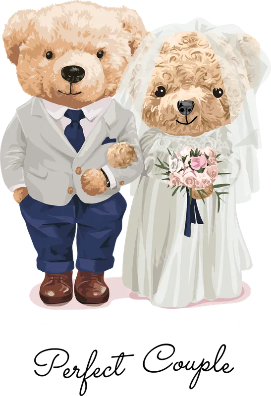 See allThis charming DTF transfer features two adorable teddy bears dressed as a bride and groom, celebrating enduring love. The groom teddy wears a smart grey suit with a navy tie, while the bride teddy is stunning in a white gown with a veil and a delicate pink and white floral bouquet. Below the happy couple, the elegant script "Perfect Couple" adds a romantic touch. This high-quality direct to film transfer is ready to press, bringing a sweet, commemorative vibe to any item. This heat press ready design is ideal for newlyweds, engaged couples, or anyone celebrating a significant anniversary. It makes a wonderful personalized gift for weddings, bridal showers, engagement parties, or Valentine's Day. Crafters and small business owners can also use this versatile iron on transfer to create custom apparel for clients, adding a unique and heartfelt touch to any celebration. Applying this apparel transfer is simple and requires no weeding. For best results, use a heat press at 300-325°F for 15 seconds with medium pressure. It adheres beautifully to a wide range of materials, including cotton, polyester, and various fabric blends. While a heat press is recommended, this durable heat transfer can also be applied with a household iron, offering flexibility for all users. Expect superior results with this professional-grade DTF transfer. Our transfers boast vibrant, true-to-color designs that are exceptionally crack-resistant and durable through countless washes. The print is incredibly soft to the touch, ensuring comfortable wear without a bulky feel. Made with premium DTF film and strong adhesive, this t-shirt transfer provides a long-lasting, high-quality finish for all your custom creations.