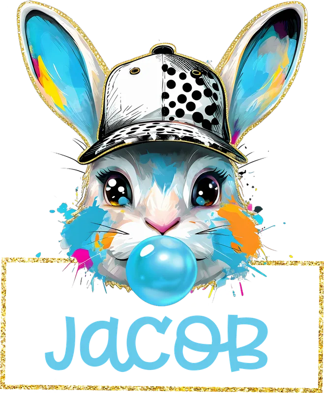 Personalized Jacob Bunny DTF Transfer with Baseball Cap & Bubblegum