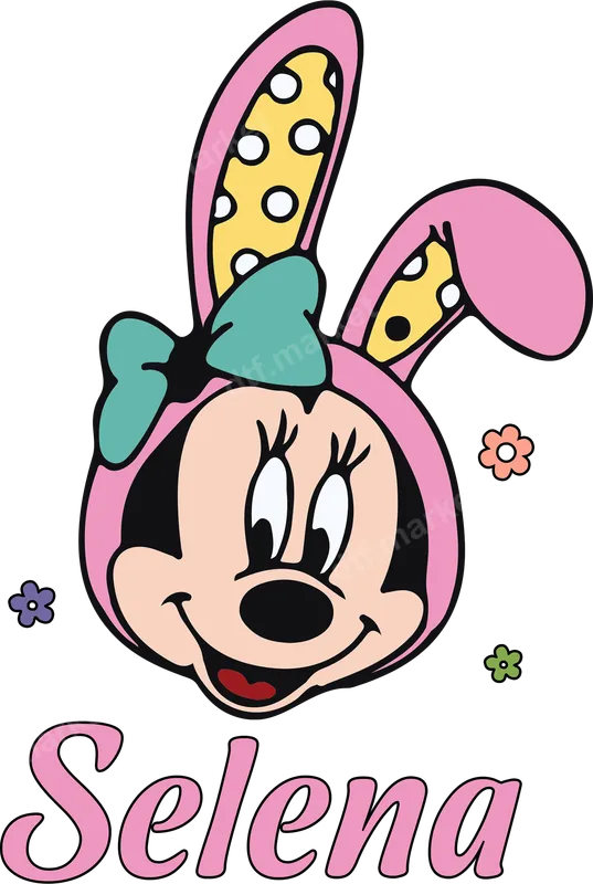See allThis cheerful DTF transfer features an iconic cartoon character, reimagined as an adorable Easter bunny. The design showcases a beloved mouse-like figure wearing a charming pink bunny suit with polka-dotted ears and a cute teal bow. Adorned with delicate pastel flowers and the sweet, personalized name 'Selena' in a lovely pink script, this ready to press transfer captures the joyful spirit of spring and Easter. Perfect for little ones and fans of cute characters, this heat transfer is ideal for creating unique personalized gifts. Celebrate Easter egg hunts, spring festivals, or simply add a touch of whimsy to everyday wear. It’s a wonderful choice for birthday celebrations, baby shower gifts, or just to surprise a special Selena with a custom item. This delightful iron on decal brings a smile to any face. Applying this vibrant direct to film transfer is effortless. It works beautifully on a wide variety of fabrics including cotton, polyester, and blends. For best results, use a heat press at 300-325°F for 15 seconds with medium pressure, then peel cold. You can also achieve great results with a household iron, following included instructions. No intricate weeding or layering required, making customization quick and simple. Experience professional-grade results with our premium apparel transfer. Our DTF transfers are known for their exceptional vibrancy, crack-resistant durability, and a soft-to-the-touch feel that integrates seamlessly with the fabric. Made using high-quality DTF film and strong adhesive, this heat press ready design ensures your custom creations will look fantastic and last wash after wash. Elevate your garments with this stunning, high-quality heat press design.