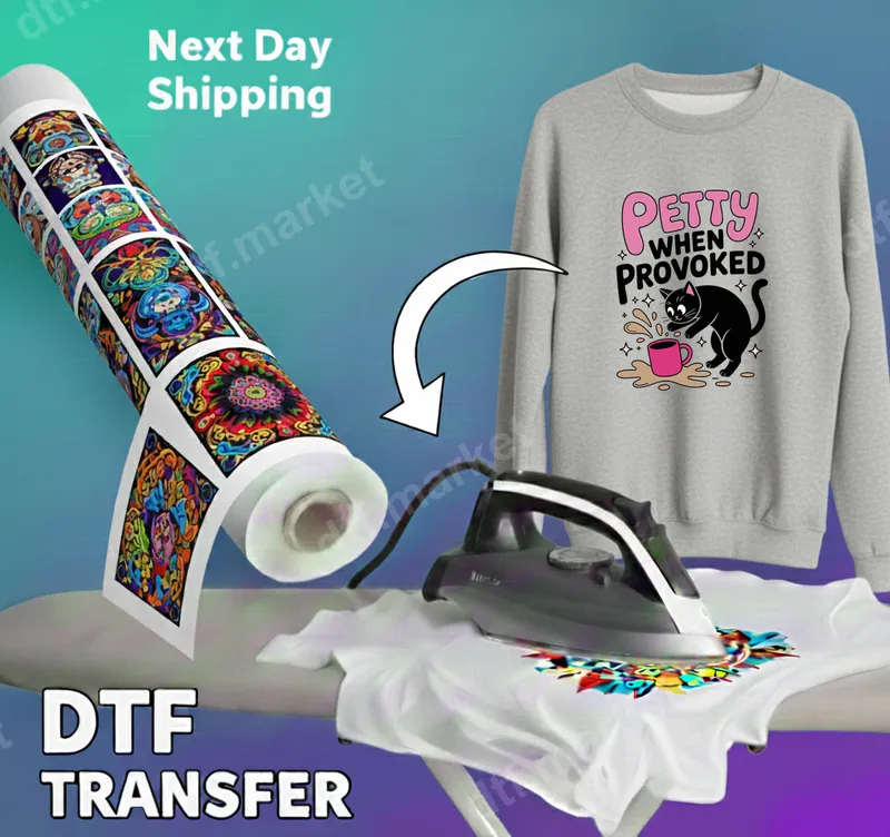 See allExpress your unique sense of humor with our "Petty When Provoked" DTF transfer, featuring a mischievous black cat knocking over a pink coffee mug. This playful design, adorned with sparkly accents and bold pink lettering, is the perfect **DTF transfer** for anyone who isn't afraid to show their sassy side. Crafted for vibrant colors and sharp details, this **ready to press** transfer brings personality to any garment. This design is ideal for cat moms, coffee addicts, and friends with a sarcastic streak. It makes a fantastic gift for birthdays, a fun statement piece for casual outings, or a perfect way to customize apparel for your own brand. Whether you’re feeling a bit cheeky or just love funny animal designs, this transfer lets you wear your attitude proudly. Applying this design is a breeze. Our high-quality **heat press transfer** works beautifully on cotton, polyester, and various blends. For best results, use a heat press at 300-325°F for 15 seconds with medium, even pressure. This versatile **iron on transfer** can also be applied using a household iron with firm, consistent pressure and no steam, making DIY customization accessible to everyone. Best of all, there's no weeding required, saving you time and effort. Experience exceptional quality with our professional-grade DTF film, designed for durability and a soft feel. This **t-shirt transfer** boasts vibrant, crack-resistant colors that will stand up to countless washes, ensuring your customized apparel looks fantastic for a long time. Our **heat press designs** offer strong adhesive properties, guaranteeing a long-lasting, high-quality finish on all your garments and accessories.