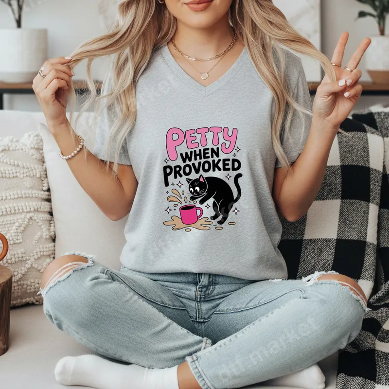 See allUnleash your inner sass with this humorous 'Petty When Provoked' DTF transfer, featuring an adorable yet mischievous black cat playfully spilling a pink coffee cup. This vibrant design captures a relatable moment for anyone who can get a little bit petty when life pushes their buttons, all delivered with a cute and cheeky vibe. This high-quality direct to film transfer is printed with premium inks on durable film, ensuring sharp details and bright colors. It's truly a ready to press transfer, making customization quick and effortless. This sassy cat design is perfect for cat parents, coffee enthusiasts, or anyone with a dry sense of humor. It makes an excellent gift for friends, family, or even yourself, ideal for birthdays, casual wear, or just adding a unique statement piece to your wardrobe. Elevate your everyday style with a design that speaks volumes without saying a word, making it a fantastic t-shirt transfer for any occasion. Applying this heat press design is a breeze. It works beautifully on a wide range of fabrics, including 100% cotton, polyester, and various blends. For best results, use a heat press at 300-325°F for 15 seconds with medium pressure, then cool peel. While a heat press is recommended for optimal adhesion, you can also achieve great results with a household iron following specific instructions. The best part? There’s absolutely no weeding required, saving you time and effort! Experience superior quality with our professional DTF transfers. Each iron on decal is designed to be incredibly vibrant, soft to the touch, and highly crack-resistant, ensuring your apparel transfer looks fantastic wash after wash. The strong adhesive ensures a lasting bond with your garment, providing a durable and professional finish every time. Get ready to transform ordinary apparel into extraordinary statement pieces that reflect your personality.