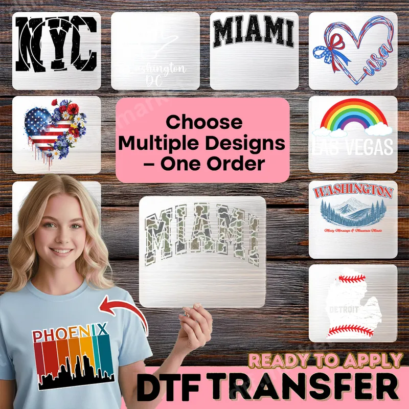 See allThe Phoenix City Skyline DTF transfer features a striking silhouette of the iconic Phoenix cityscape beneath bold, colorful "PHOENIX" lettering. This ready to press design captures the vibrant energy and spirit of Arizona's capital, making it a perfect statement piece. Crafted as a high-quality direct to film transfer, it offers an instant way to customize your apparel. This vibrant t-shirt transfer is ideal for Phoenix residents, visitors, or anyone with a love for the Sonoran Desert city. Perfect for personalizing clothing for local events, travel souvenirs, or showing off your hometown pride. It makes an excellent gift for friends and family, allowing them to wear their Phoenix spirit on custom t-shirts, hoodies, or tote bags. Applying this apparel transfer is simple and efficient. Our heat press ready transfers work beautifully on a wide range of materials, including cotton, polyester, and various blends. For best results, use a heat press at 300-325°F for 15 seconds with medium pressure. No complicated weeding or layering required, making it an easy iron on transfer for beginners and pros alike. Each DTF transfer is produced with professional-grade film, ensuring exceptional vibrancy and durability. The colors are designed to remain vivid, resisting cracking and peeling even after multiple washes. Enjoy a soft, smooth feel on your garment, making this a comfortable and long-lasting heat transfer for any custom project.