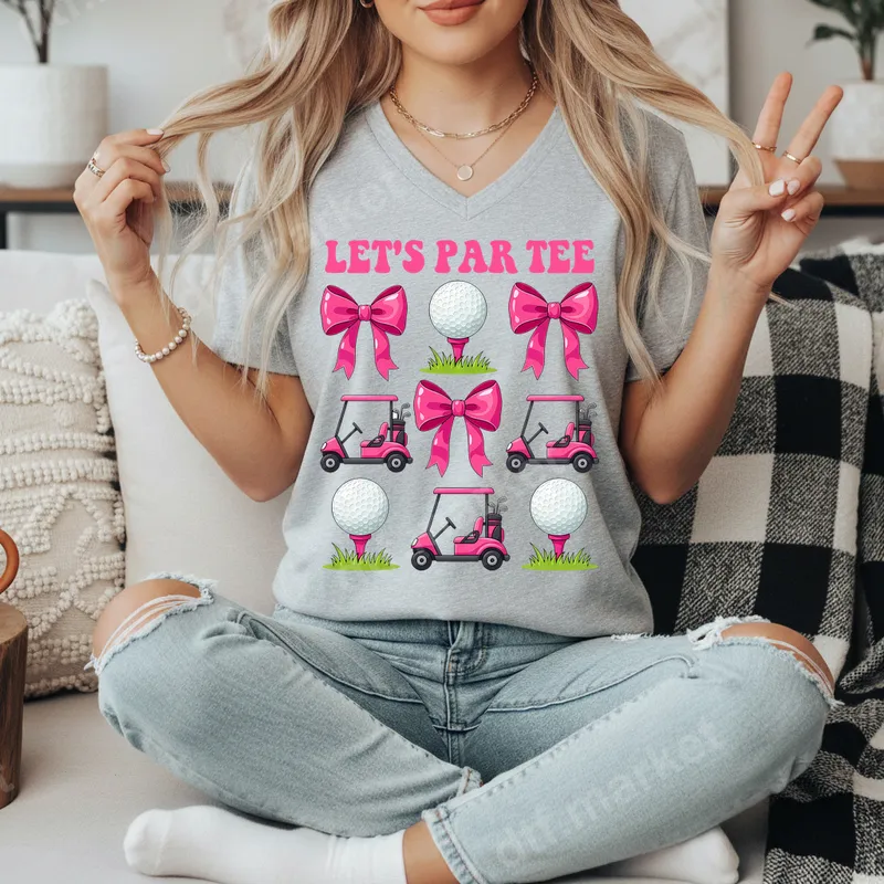 See allThis charming DTF transfer features a playful "LET'S PAR TEE" slogan in vibrant pink, surrounded by an adorable array of pink bows, classic golf balls on tees, and cute pink golf carts. It perfectly captures the fun and feminine spirit of a day on the green, making it an ideal ready to press design for anyone who loves golf with a touch of flair. The cheerful aesthetic is sure to bring a smile to any golf enthusiast. This direct to film transfer is perfect for women who love golf, whether for casual games, league play, or themed golf outings like bachelorette parties or girls' golf trips. It makes a fantastic gift for golf moms, grandmothers, sisters, or friends, and is ideal for custom apparel for golf tournaments, birthdays, or Mother's Day. Create unique iron on designs for your whole golf crew! Applying this heat press transfer is incredibly easy. It adheres beautifully to a wide range of fabrics, including cotton, polyester, and various blends, ensuring versatility for your projects. For best results, use a heat press at 300-325°F for 15 seconds with medium pressure. It can also be applied with a high-quality household iron. Best of all, there's no weeding or intricate layering required, making customization quick and effortless. Experience professional quality with this DTF transfer. The colors are exceptionally vibrant and designed to resist cracking and peeling, ensuring your finished garment looks great wash after wash. Our premium DTF film provides a soft, flexible feel that seamlessly integrates with the fabric. This durable apparel transfer is built to last, maintaining its appeal for years to come.
